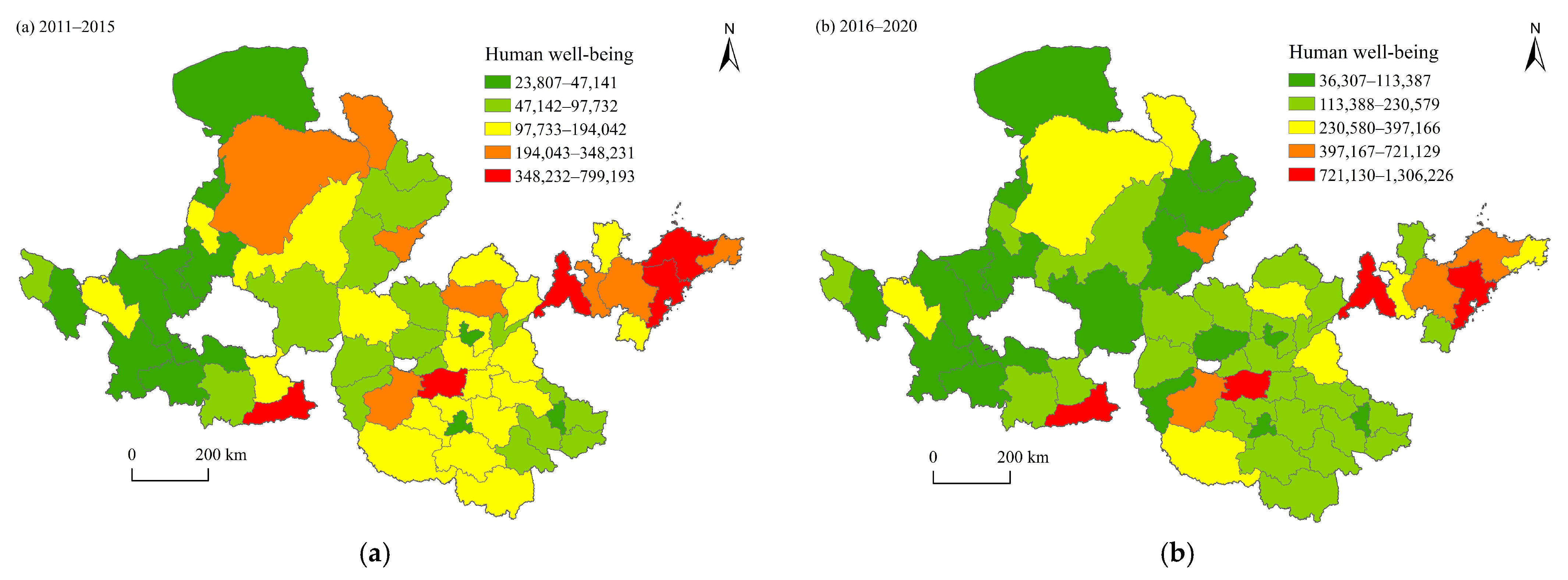 4.2. Spatial Pattern Analysis of Human Well-Being Development Level