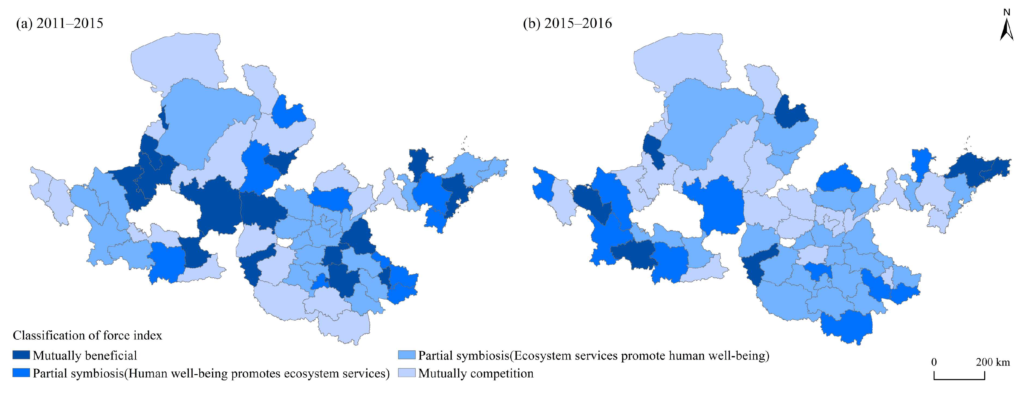 | 2011–2015 | SE > 0, SH < 0 Ecosystem services promote human well-being, and human well-being inhibits ecosystem services. | SE < 0, SH > 0 Ecosystem services inhibit human well-being, and human well-being promotes ecosystem services. | SE < 0, SH < 0 Ecosystem services and human well-being inhibit each other. | SE > 0, SH < 0 Ecosystem services promote human well-being, and human well-being inhibits ecosystem services. | SE < 0, SH < 0 Ecosystem services and human well-being inhibit each other. |