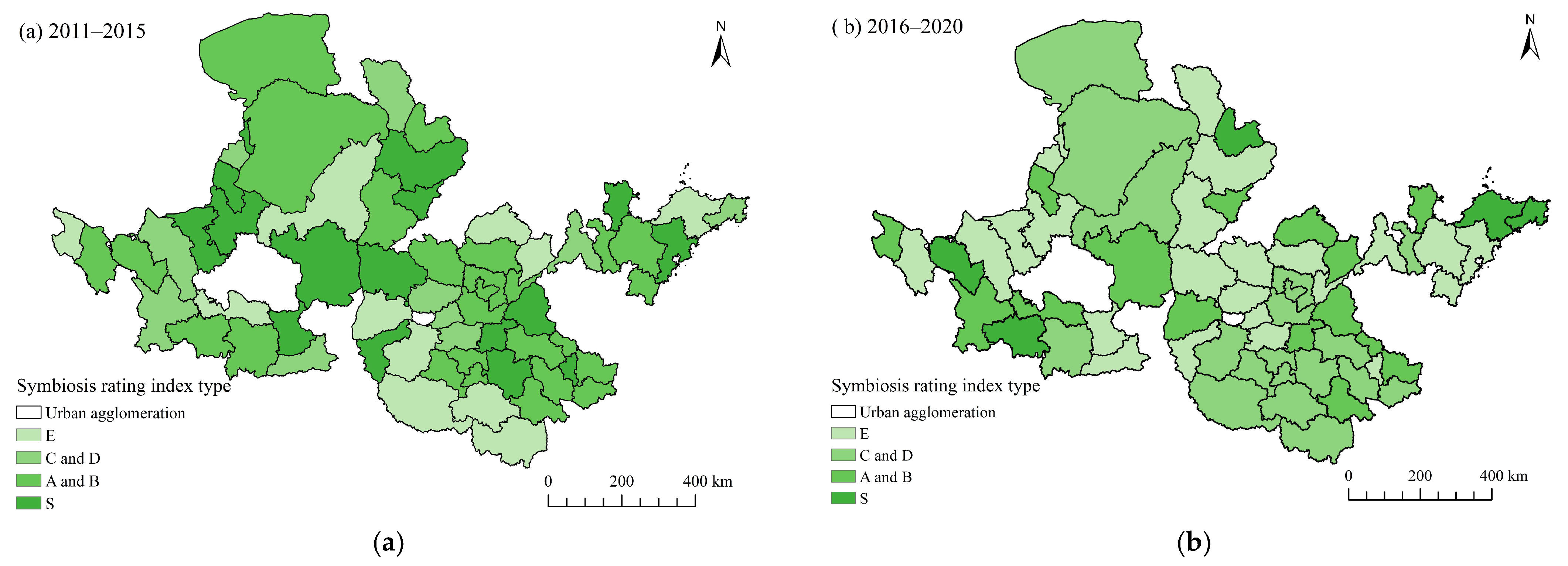 - The model results of this study indicate that the overall human–land relationship within the “Five Poles” of the Yellow River Basin has undergone a paradigm shift from partial symbiosis (2011–2015, SE > 0, SH < 0) to mutually beneficial symbiosis (2016–2020, SE > 0, SH > 0). This transformation did not occur uniformly but exhibited significant inter-city heterogeneity. Specifically, while the Ji-shaped Bend Metropolitan Area maintained its original partially symbiotic pattern, the other four urban clusters all upgraded their symbiosis models: the Shandong Peninsula and Central Plains Urban Clusters advanced from partially symbiotic or mutually inhibitory to mutually beneficial symbiosis (S-level), while the Guanzhong Plain and Lanzhou-Xining Urban Clusters transitioned from mutual inhibition (E-level) to lower-level coordinated symbiosis (C-level and D-level). This finding demonstrates that during the 13th Five-Year Plan period, the synergy between ecological conservation and socioeconomic development has substantially strengthened across most regions of the Yellow River Basin.