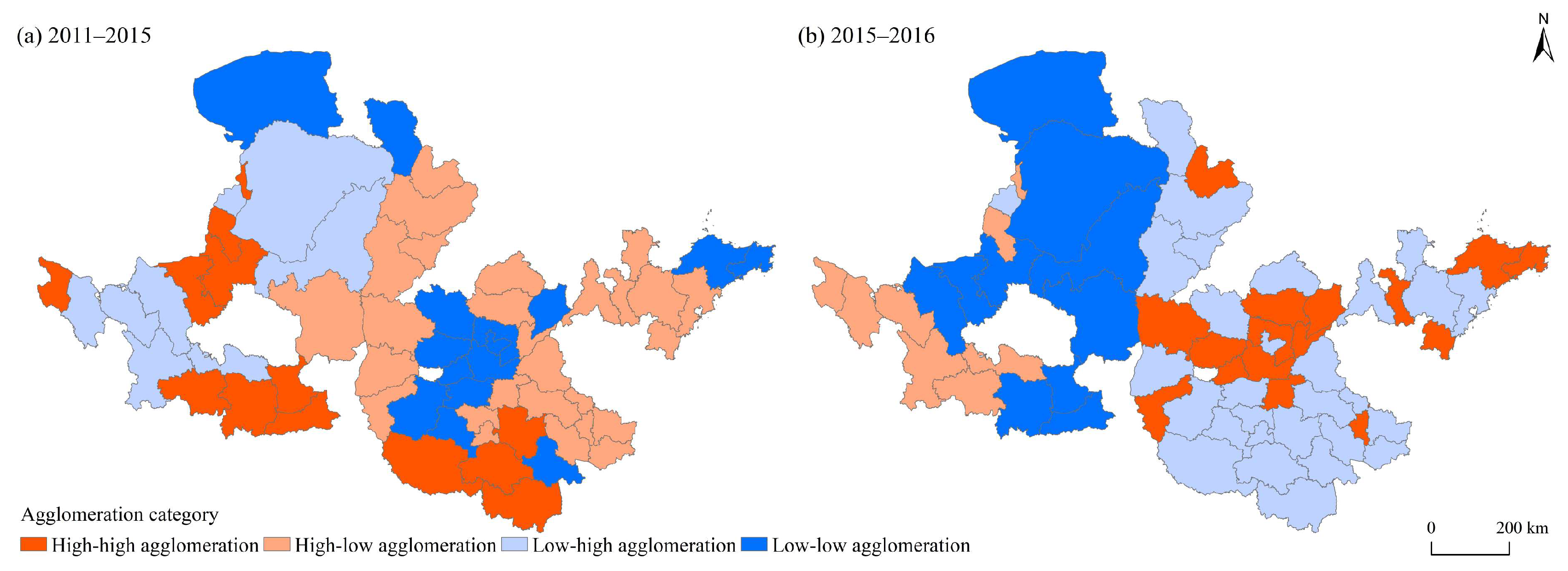 4.4. Spatial Pattern and Agglomeration Characteristics of the Symbiotic Relationship