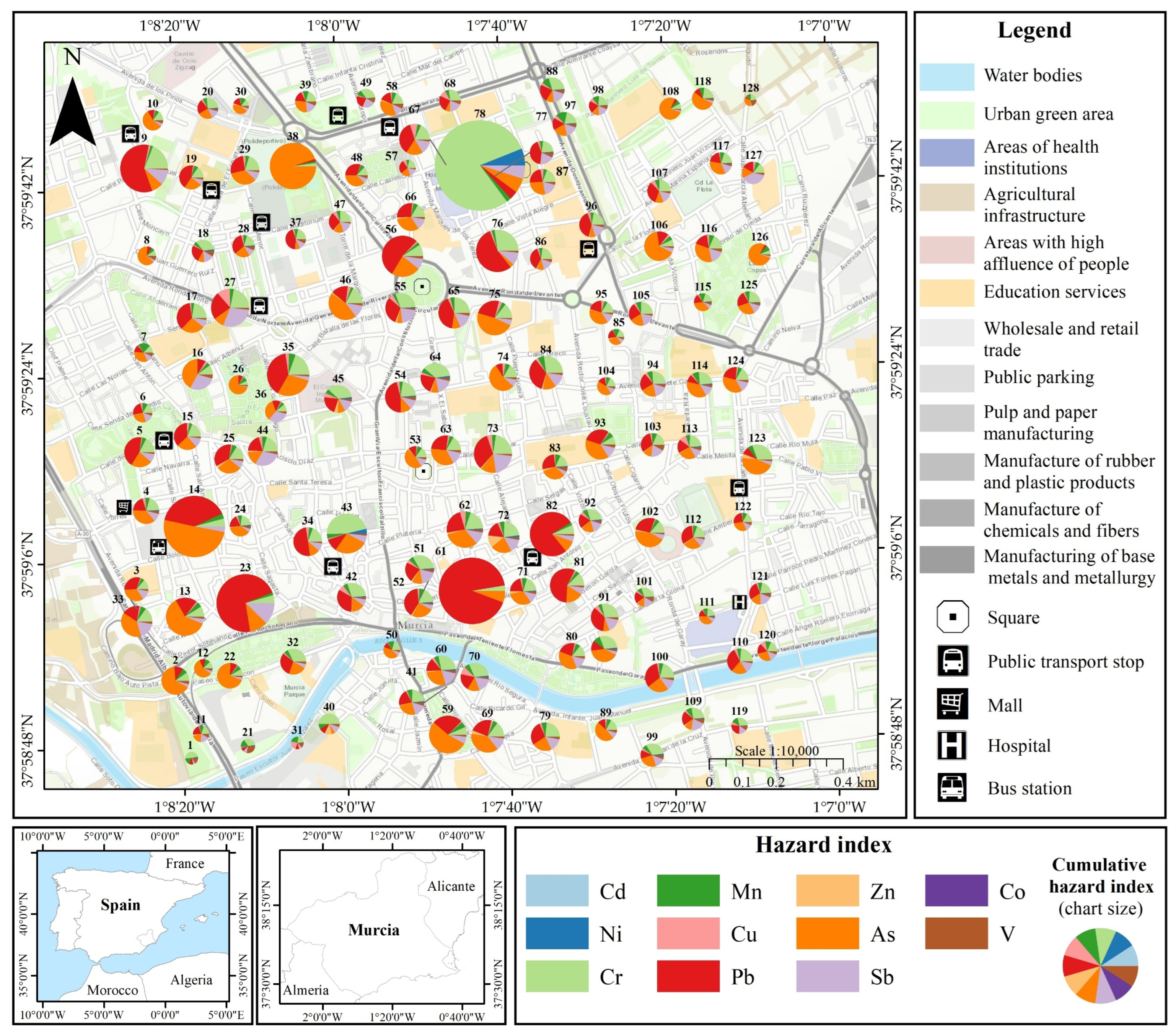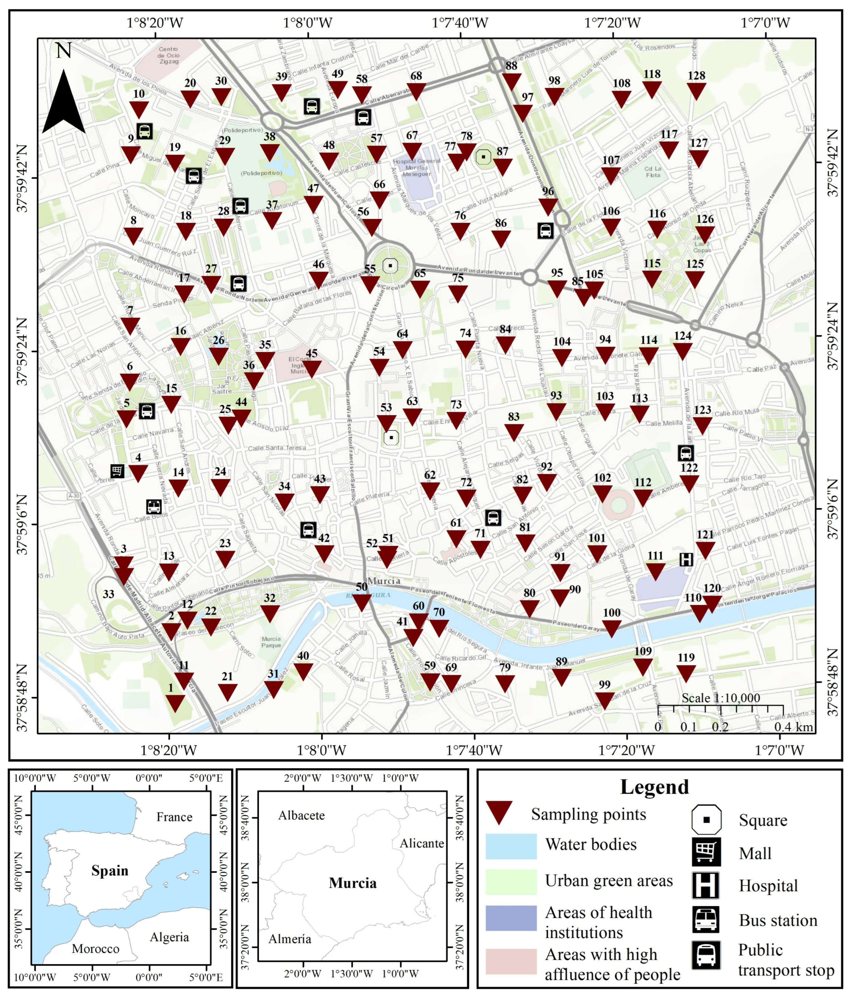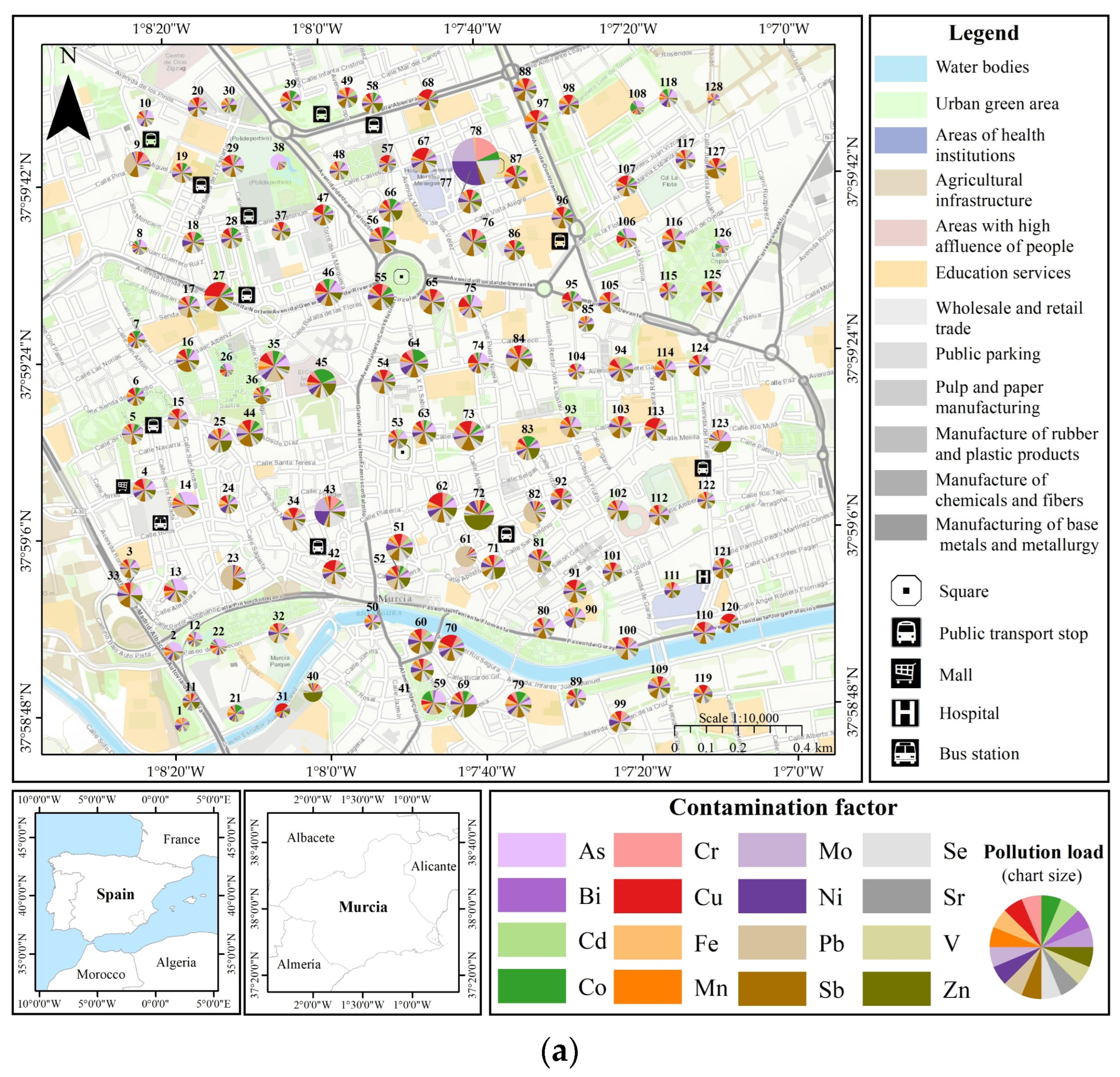 - Marín-Sanleandro, P.; Delgado-Iniesta, M.J.; Sáenz-Segovia, A.F.; Sánchez-Navarro, A. Spatial Identification and Hotspots of Ecological Risk from Heavy Metals in Urban Dust in the City of Cartagena. SE Spain Sustain. 2024, 16, 307. [Google Scholar] [CrossRef]