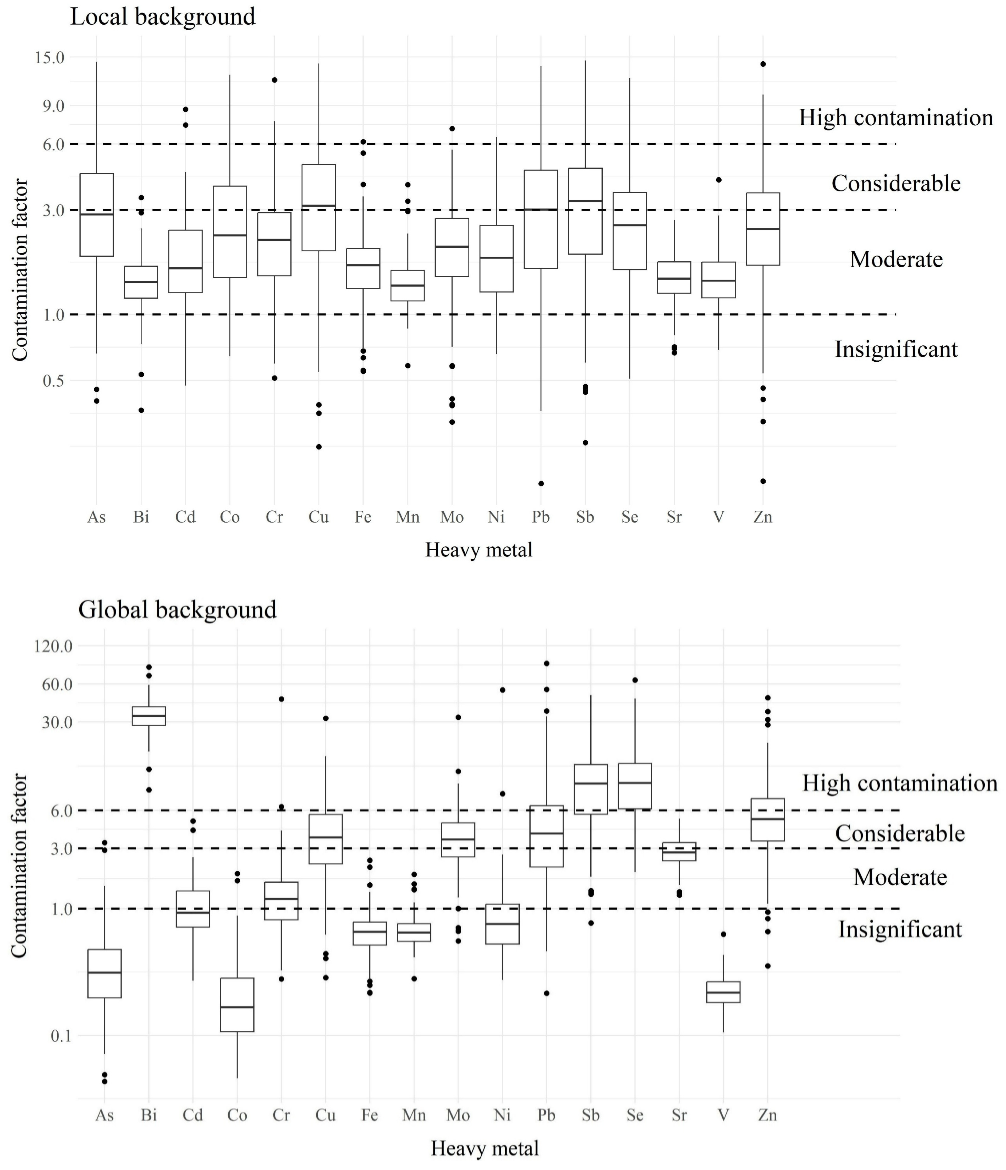 - Dytłow, S.; Górka-Kostrubiec, B. Concentration of heavy metals in street dust: An implication of using different geochemical background data in estimating the level of heavy metal pollution. Environ. Geochem. Health 2021, 43, 521–535. [Google Scholar] [CrossRef]