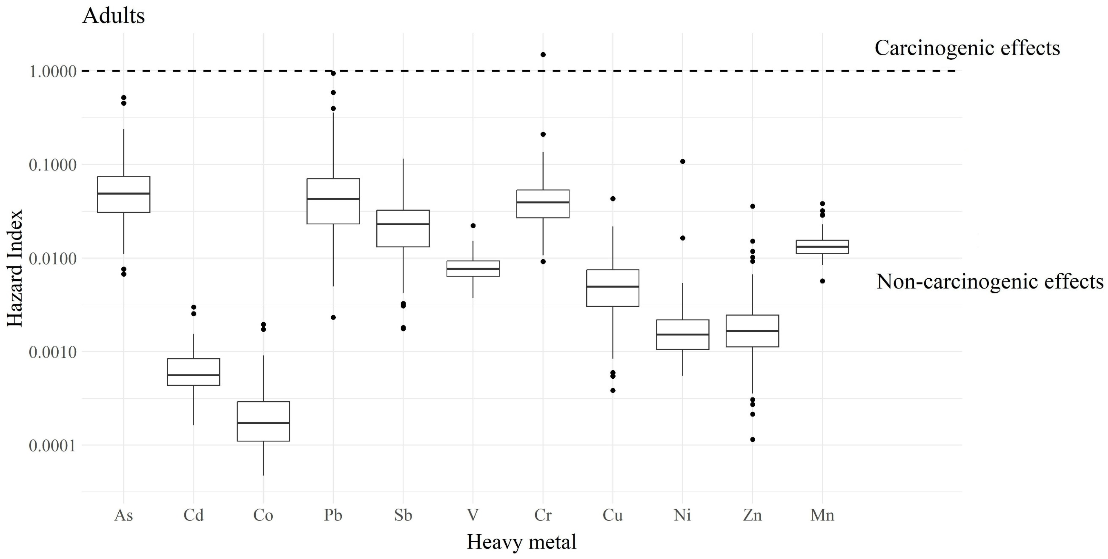 - Budi, H.S.; Catalan Opulencia, M.J.; Afra, A.; Abdelbasset, W.K.; Abdullaev, D.; Majdi, A.; Mohammadi, M.J. Source, toxicity and carcinogenic health risk assessment of heavy metals. Rev. Environ. Health 2024, 39, 77–90. [Google Scholar] [CrossRef]