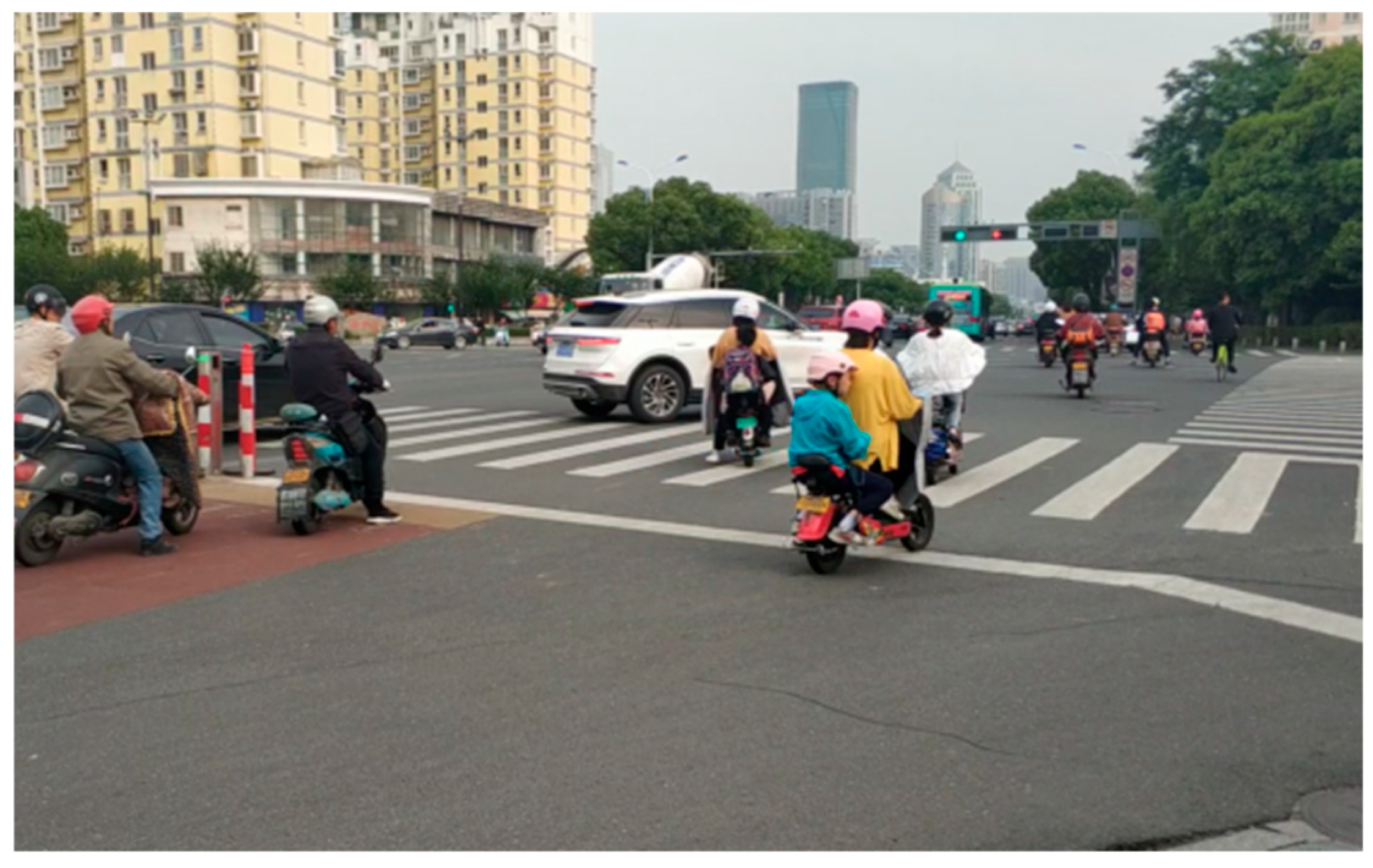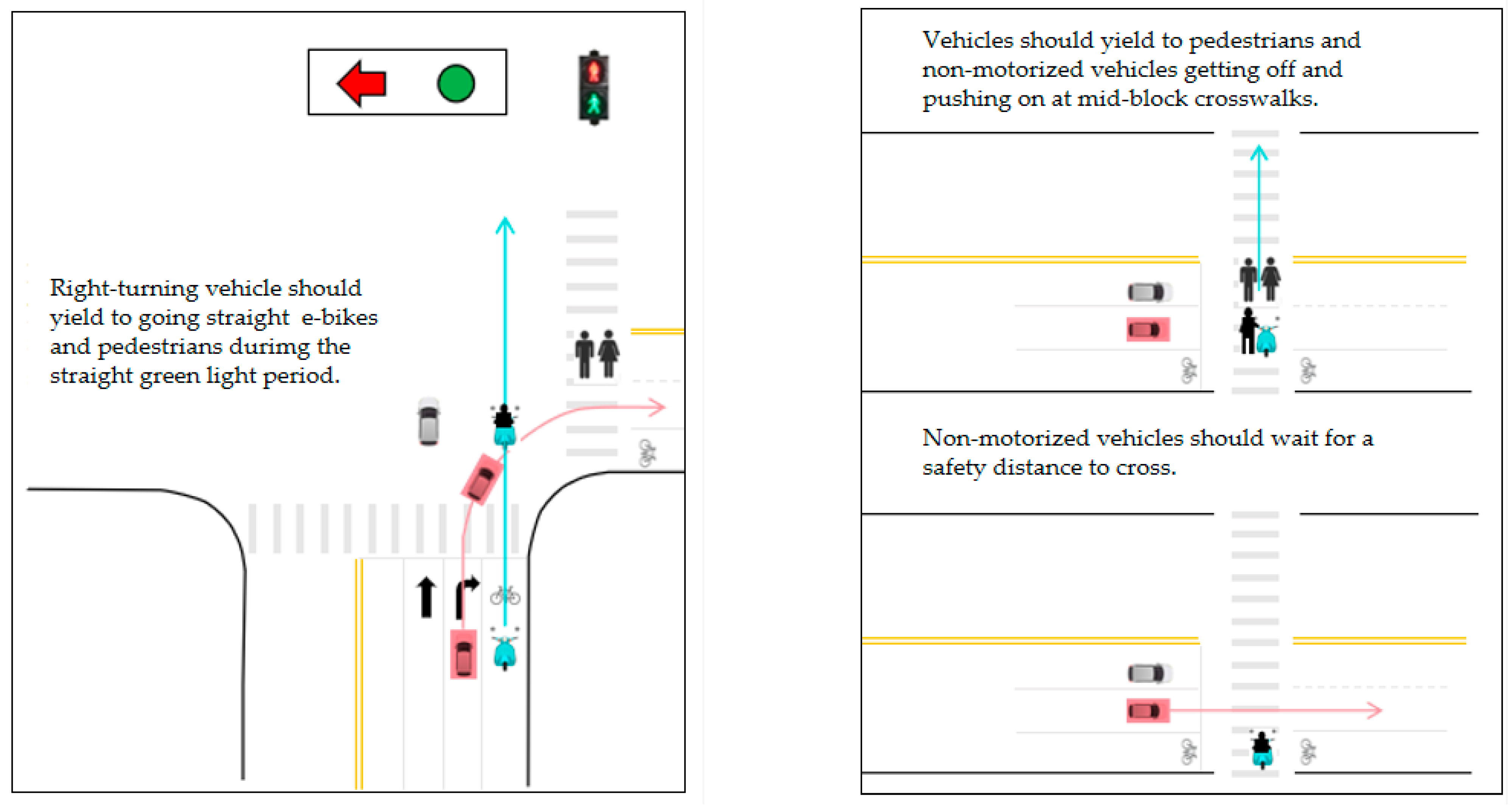 12]. When passing through intersections, e-bike riders rarely dismount to push along the crosswalk, and the yielding behavior of right-turning vehicles toward e-bikes is unclear within the intersection area. Research has found that cyclists are more likely to disregard the “priority-to-the-right” rule than motorists; at this point, the yielding behavior of right-turning vehicles largely determines the safety of non-motorized vehicles and pedestrians crossing the intersection [