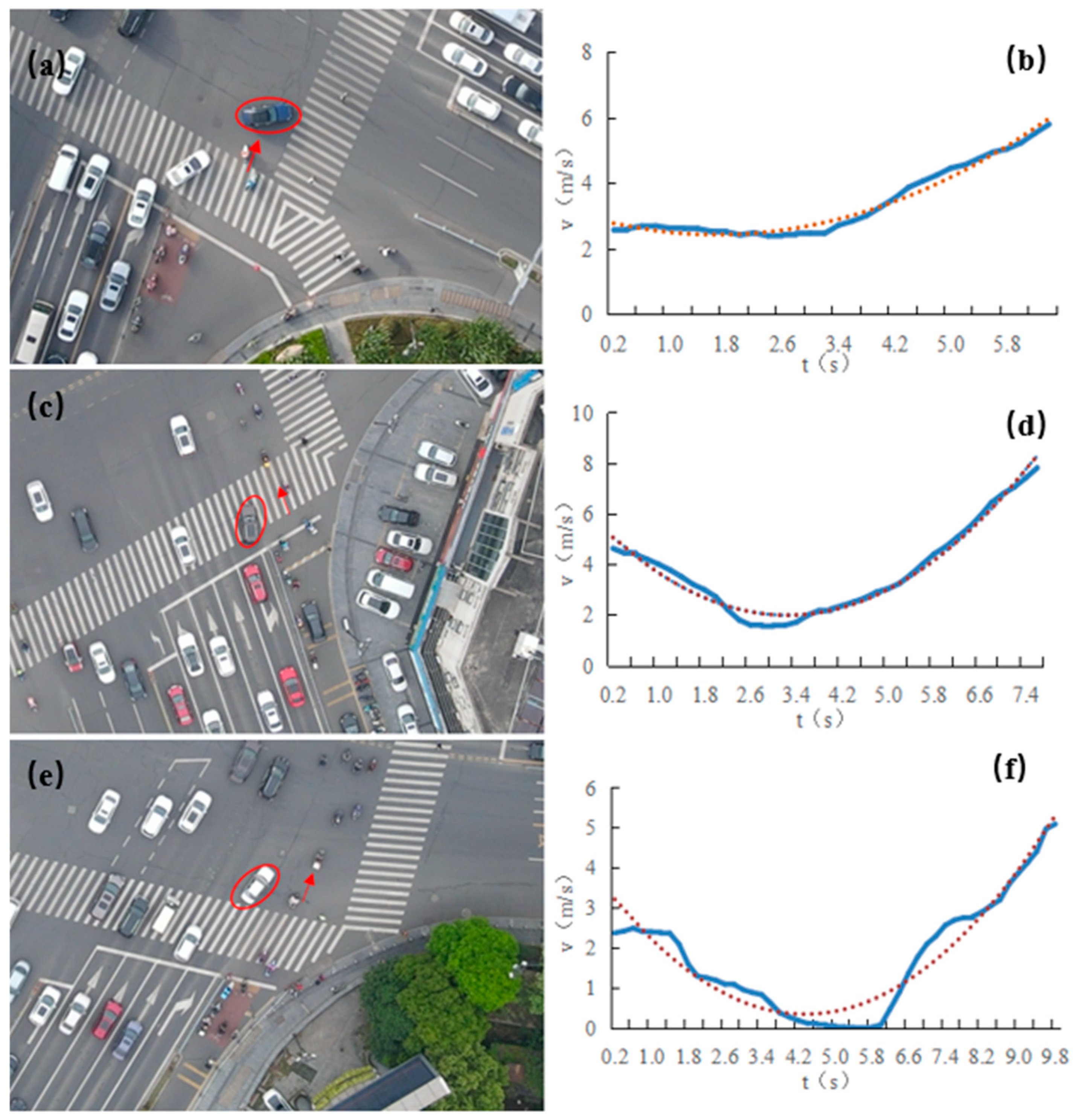 (1) The yielding behavior of right-turning vehicles was divided into three categories: not yielding, slowing down to yield, and stopping to yield, according to the speed change of right-turning vehicles. The survey data showed that at a signal intersection right-turning vehicles give way to the highest proportion, in which the deceleration and stopping to give way are 61.2% and 6.2%, respectively; but still 32.6% of the right-turning vehicles did not give way to e-bikes crossing the street, whether at a uniform speed or even accelerating through the intersection.