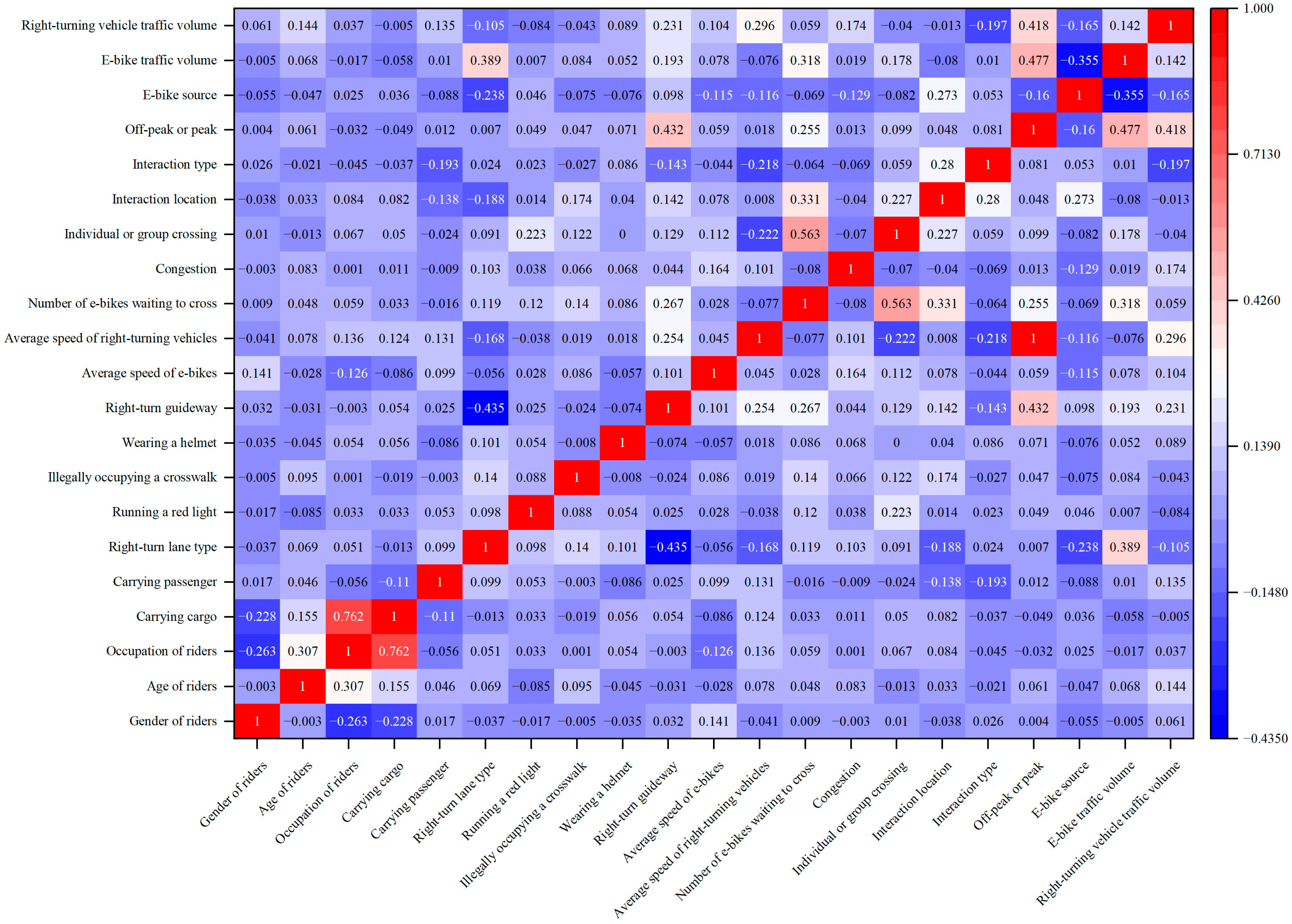 In addition, based on the correlation analysis results, this study excluded the variable “carrying cargo”. The core reason is that there is a medium to high correlation (r = 0.762) between “carrying cargo” and “occupation of e-bike riders”. The behavior of delivery person riding e-bikes differs from that of ordinary riders, mainly due to the time pressure brought by the delivery industry’s timeliness assessment. Time pressure will prompt a delivery person to ride faster, making more dangerous decisions when crossing the intersection, and thus affecting the judgment of right-turning vehicles to yield.