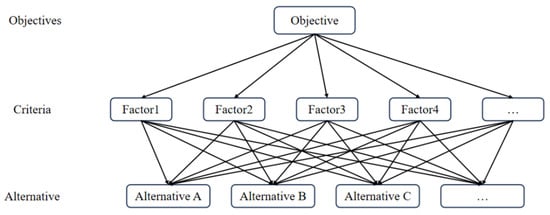 AHP is a straightforward, adaptable, and pragmatic multiple-criteria decision-making methodology for the quantitative dissection of qualitative issues, and it is a combination of subjective and objective methods of assigning weights, which are mainly used for solving evaluation-type problems [18].The main feature of AHP is to transform human judgments into comparisons of the importance of a number of factors two-by-two, known as the decision-making level, by establishing a recursive hierarchical structure (Figure 2). The qualitative judgment, which is difficult to quantify, is transformed into an actionable comparison of importance, called the criterion layer.