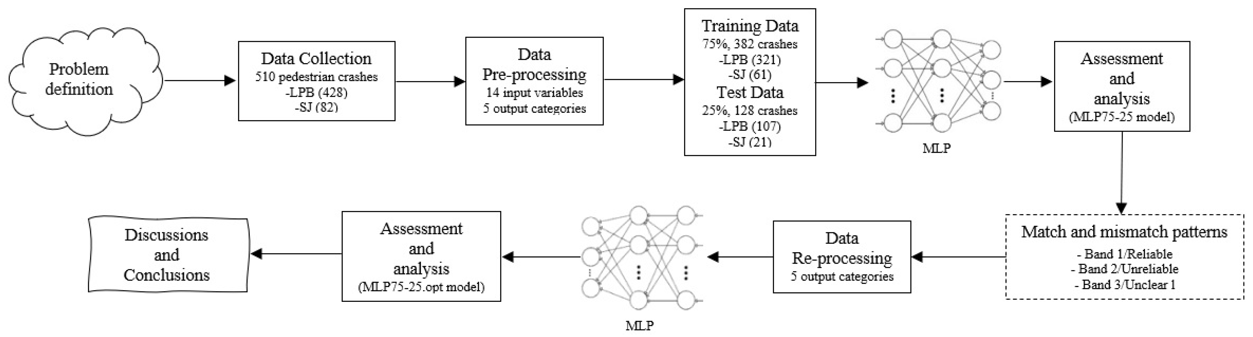 In Figure 1 a research flow chart of the present work is shown. It provides a clear overview of our study. The process begins with the identification of the problem. Next, real and reliable data are collected from authorized databases -Local Police of Badajoz (LPB) and Spanish Judiciary (SJ)-. The data are preprocessed to determine the 14 input variables and five output categories. Then, the data are processed using the MLP75-25 model to analyze the metrics and their output parameters. After identifying the match and mismatch patterns, the data are reprocessed and optimized by determining different reliability bands (Band 1/Reliable, Band 2/Unreliable, and Band 3/Unclear) and reassigning mismatches. Finally, the optimized MLP75-25.opt is evaluated, and key insights and practical implications are discussed.