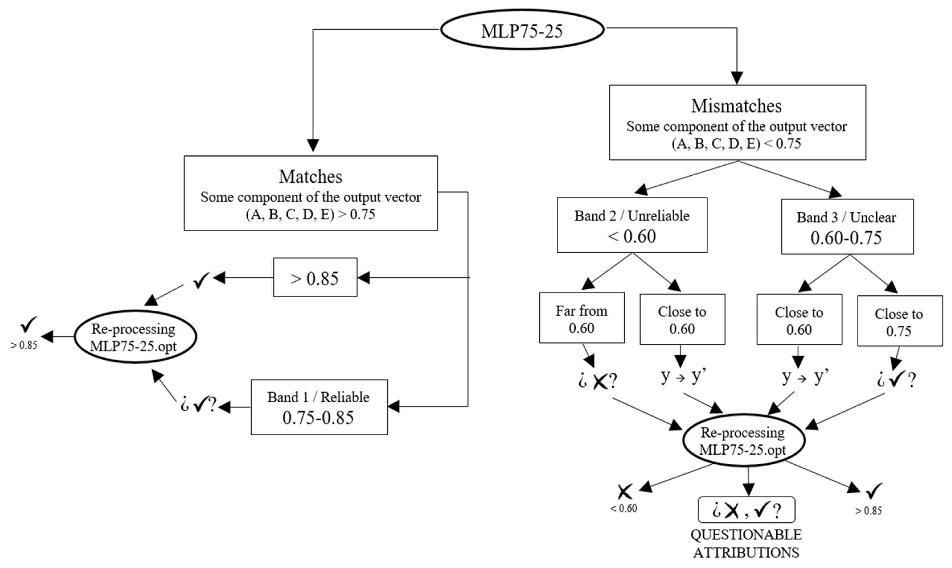 In order to try to overcome the distortion caused by these subjective decisions a reprocessing of the training dataset is proposed. The inaccurate patterns are identified and the classifications assigned in the JTP reports of the LPB and the SJ judicial decisions are modified to align with the categories identified by the MLP model. In other words, when a mismatch is detected, the classification is changed to that provided by the neural model.