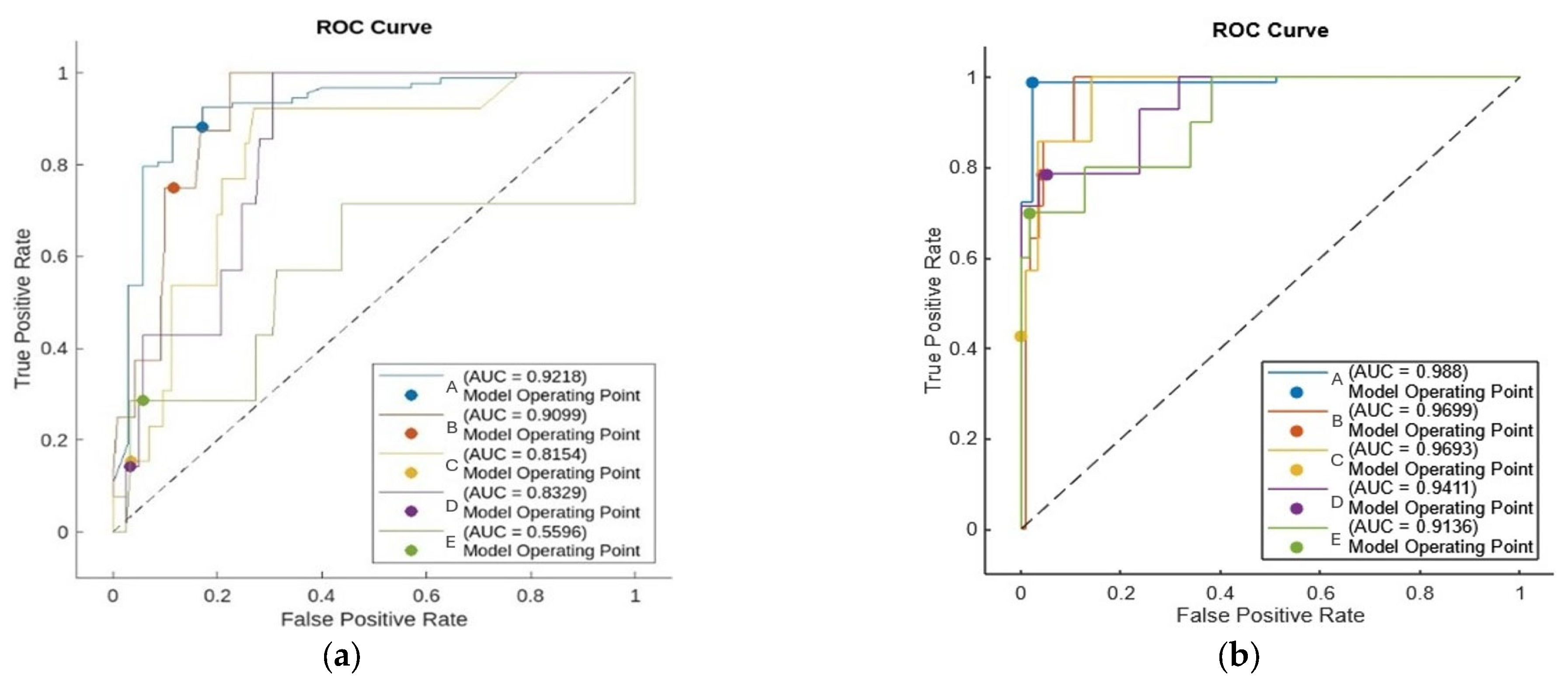 The ROC represents the curve for a given category describing the relationship between TP and FP rates as an average to evaluate the performance of the classification model [61]. The closer the ROC curve to the upper left corner, the better the performance of the model. The Area Under the Curve (AUC) value represents the area of the graph enclosed by the abscissa and ordinate axes below the ROC curve. It ranges from 0 to 1. The closer the AUC value is to 1, the better the model performance [62].