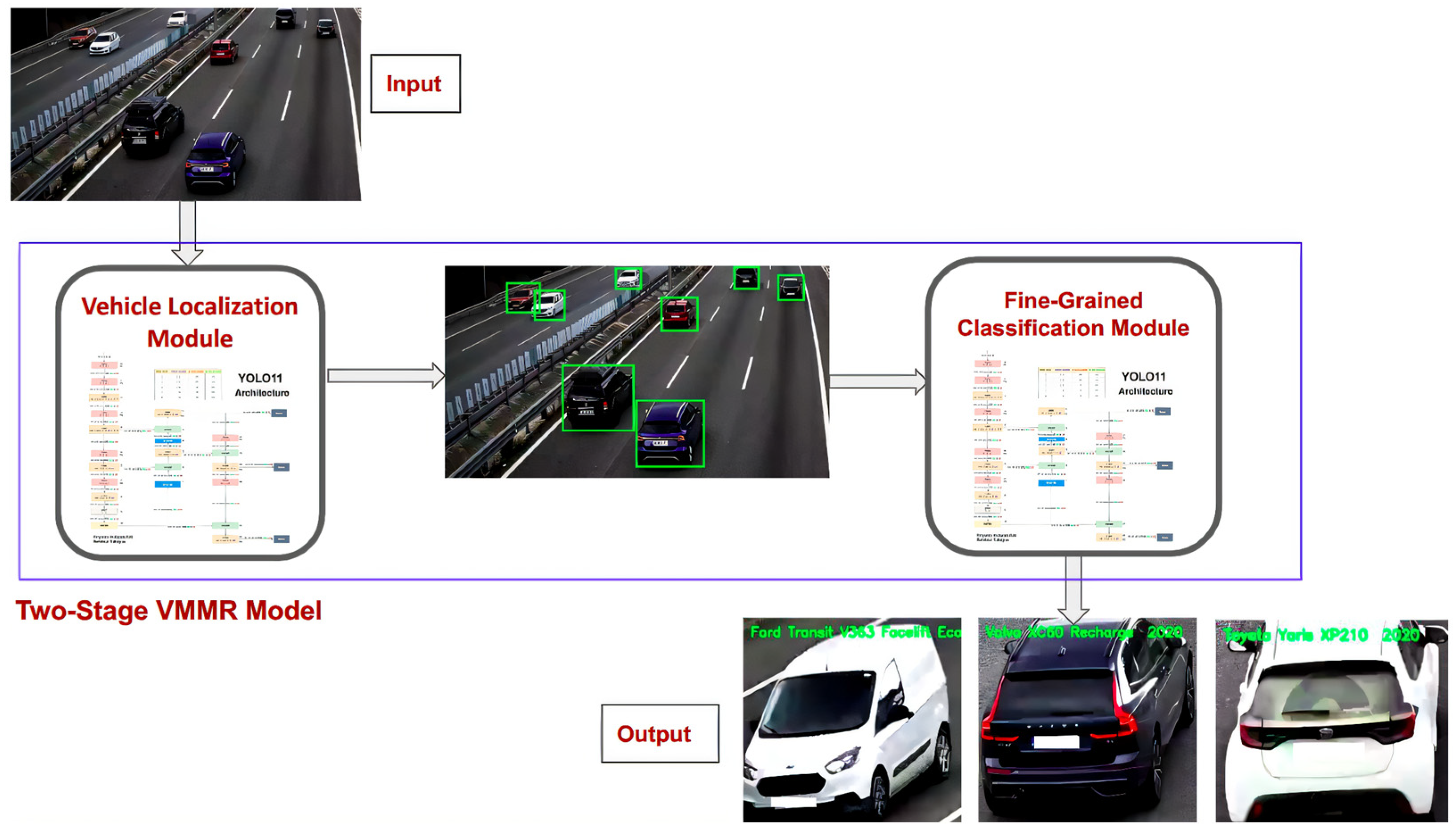 Accurate vehicle make and model classification requires high-resolution images that capture the detailed features of individual cars. In real-world traffic scenes, vehicles appear at different distances and sizes, making it challenging to classify them directly from a full image. To address this, our system separates detection and classification into two distinct yet connected steps. First, the Vehicle Localization Module (VLM) locates and crops each vehicle to produce close-up images. Then, the Fine-Grained Classification Module (FGCM) uses these cropped images to identify the vehicle’s make, model, and generation. This two-stage pipeline provides the FGCM with clearer, more detailed inputs, enabling it to distinguish between similar models and different versions, even in multi-vehicle scenes.