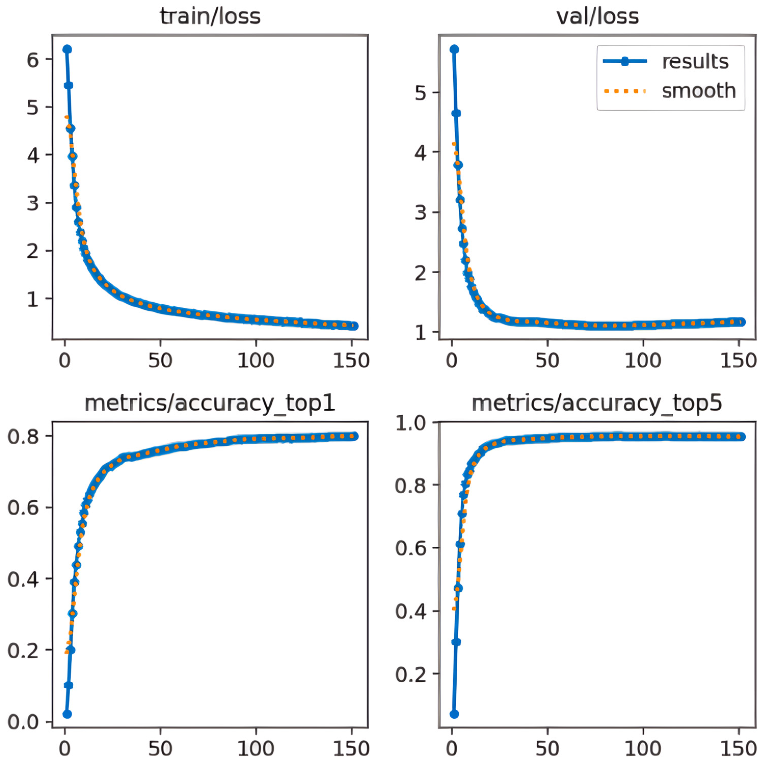 The fine-tuning of the YOLO11 classification model on our custom vehicle dataset demonstrated clear improvements throughout the training process. Over approximately 150 epochs, the model achieved consistent reductions in loss and significant gains in classification accuracy (