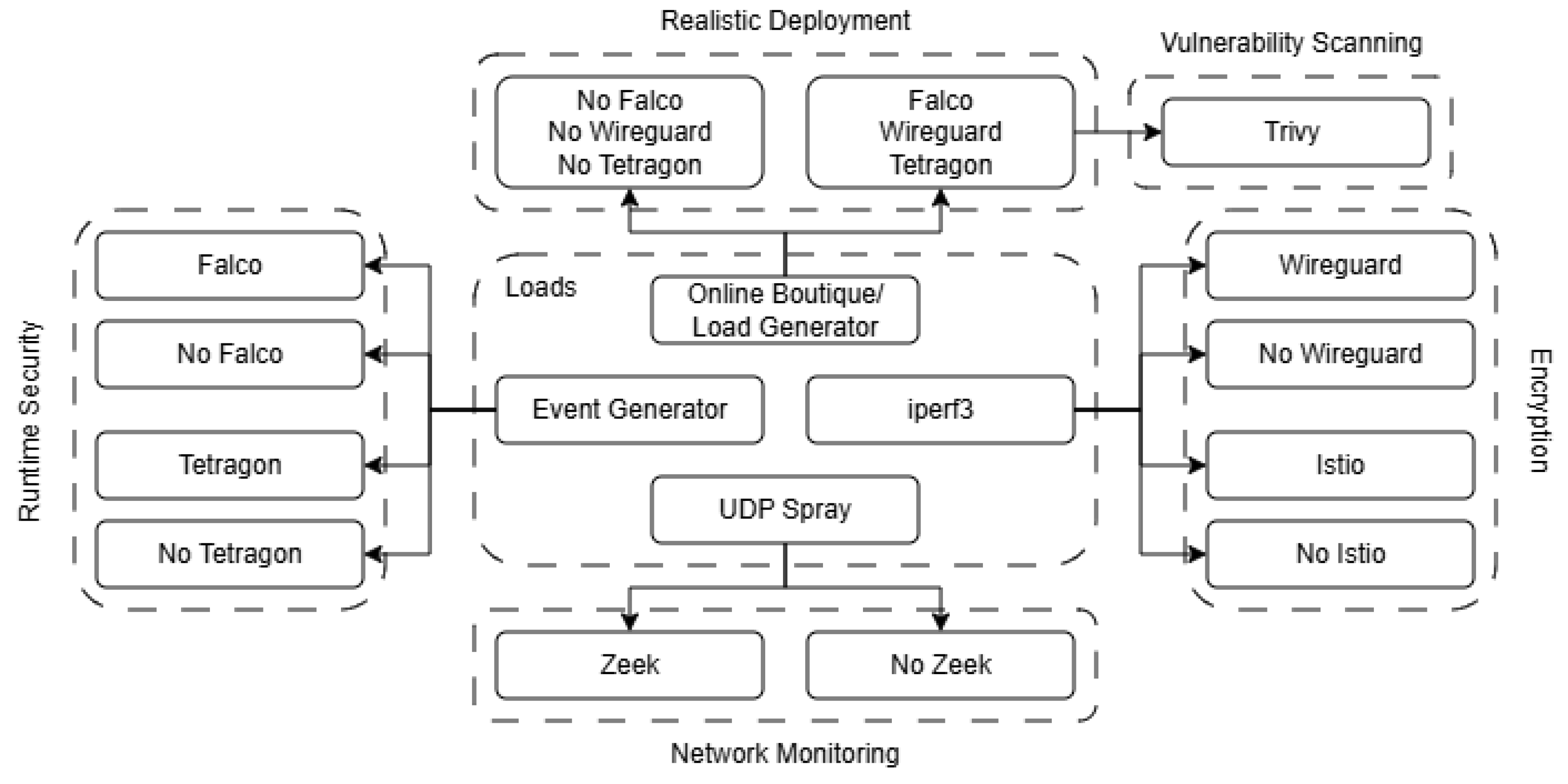 STRICT mTLS policy and evaluated against the plain networking configuration. Runtime security is toggled by enabling/disabling Falco (default ruleset) and Cilium Tetragon under the Falco Event Generator (EG). For network security monitoring, Zeek is deployed as a K8s DaemonSet on all worker nodes with the default configuration, while the UDP Spray is active. To capture interactions under realistic load, Online Boutique (OB) is deployed while selectively enabling WireGuard, Falco, and Tetragon, since real-world deployments usually combine multiple security measures to ensure the resilience of the cluster. Finally, the energy cost of vulnerability assessment (Trivy) is measured in the cluster.