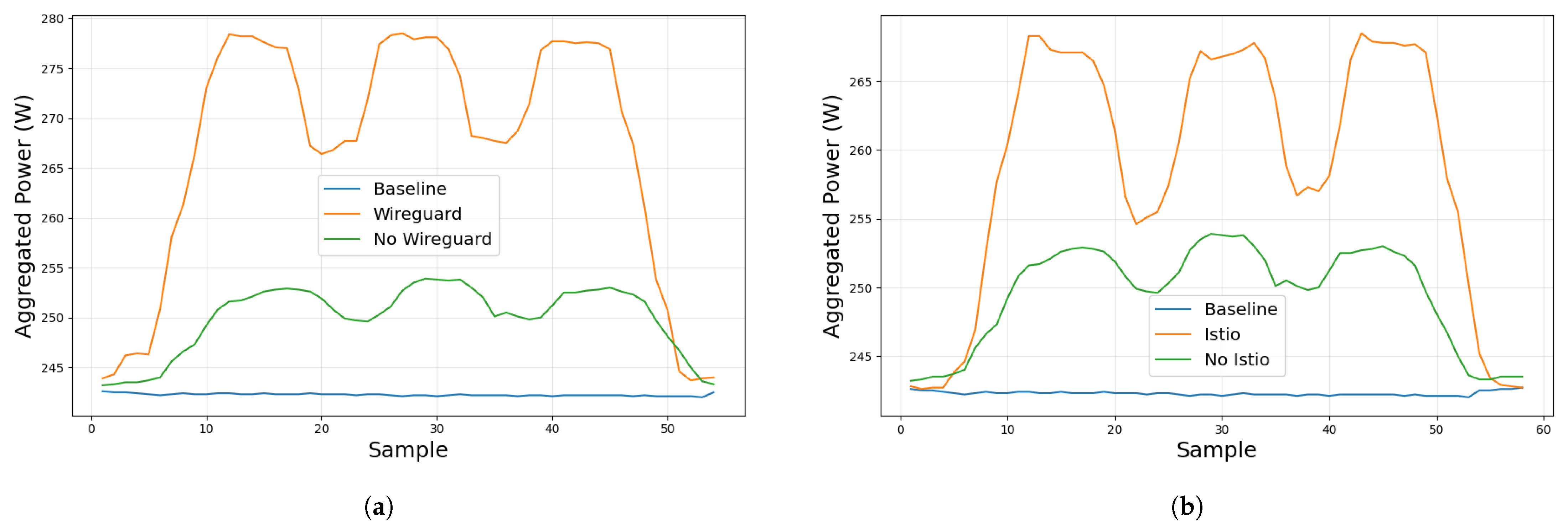 https://linkerd.io/ (accessed on 3 December 2025))) provide cluster-wide mutual TLS (mTLS), per-flow confidentiality, integrity, and peer authentication, while automating certificate issuance and rotation, authorization policies, and observability. While these capabilities greatly strengthen security with minimal application changes, they also introduce proxy and control-plane overhead, which can impact performance (e.g., latency and throughput) and energy consumption.
