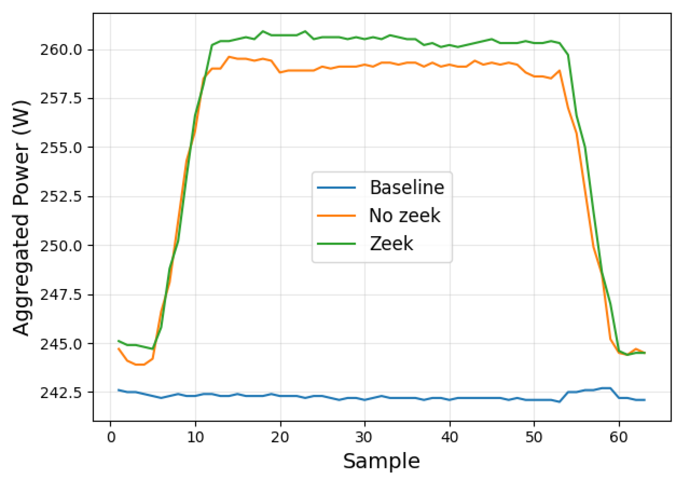 Figure 4 shows the difference in energy consumption between a high-rate UDP spray and the same traffic with Zeek enabled. The spray increases power to a steady plateau (orange), while enabling Zeek produces a further persistent but modest increase (