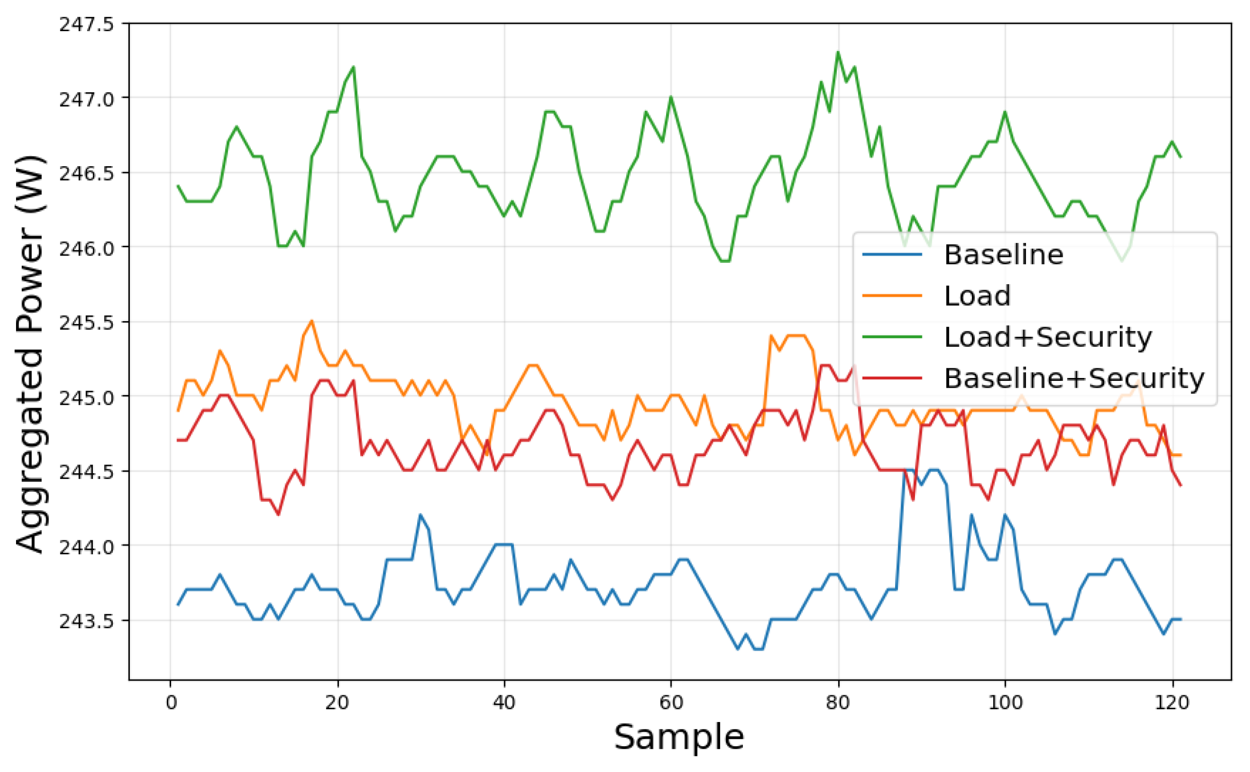 Figure 7 and the cluster’s baseline, capturing the absolute uplift over an idle system. After that, we provide the mechanism’s mean and peak power minus the experimental baseline, isolating the overhead introduced solely by the security component. In the final column, standard deviation (SD) is calculated to quantify temporal power variability.