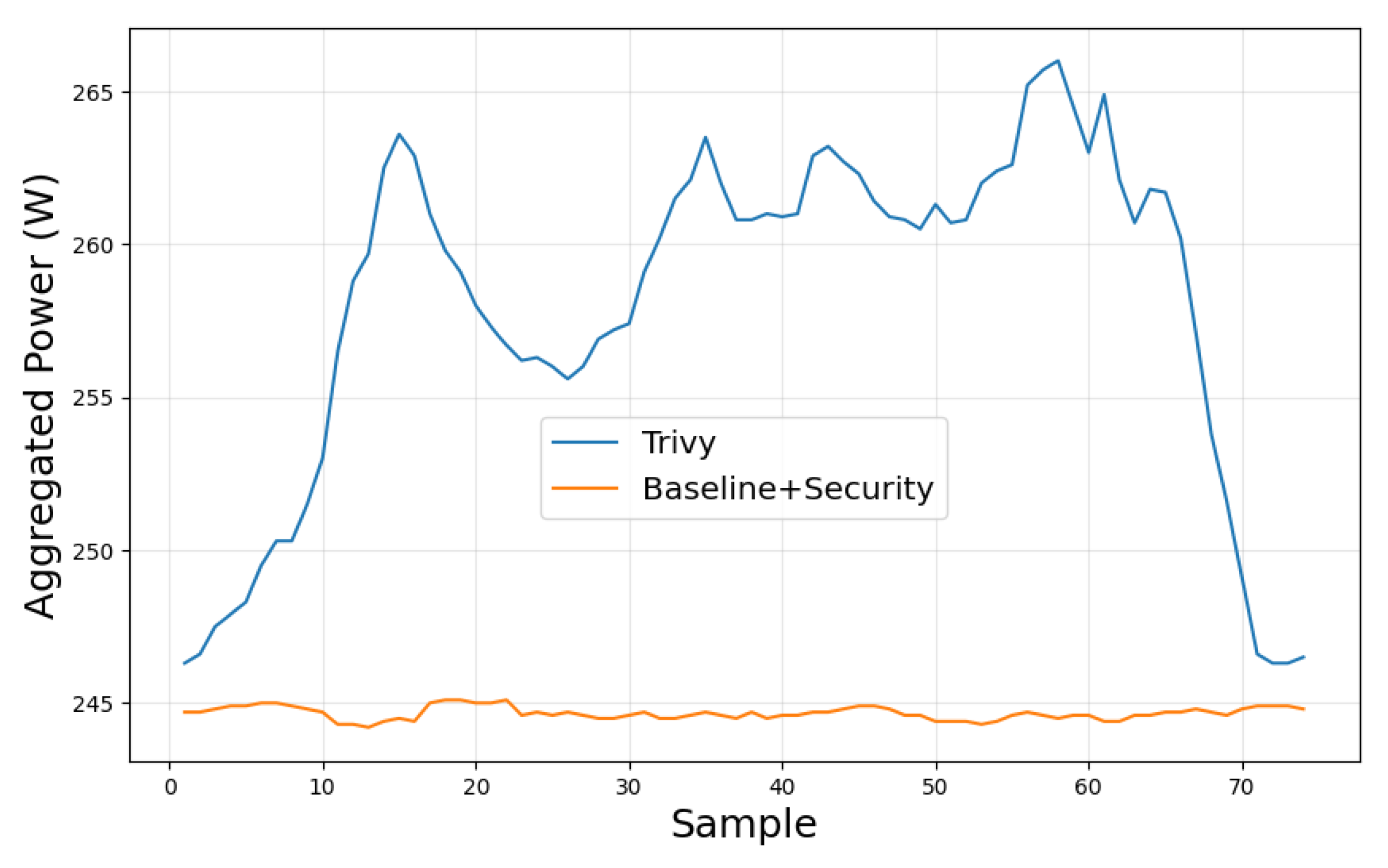 Although each scan produces only a short-lived but significant increase in power draw (15–20 W), these spikes will recur periodically with the Trivy operator as part of routine cluster hardening. In practice, the energy impact becomes a sequence of brief bursts rather than a continuous overhead. The behavior can be shaped—but not eliminated—by tuning scan frequency and scoping (e.g., limiting scans to selected namespaces and workloads).
