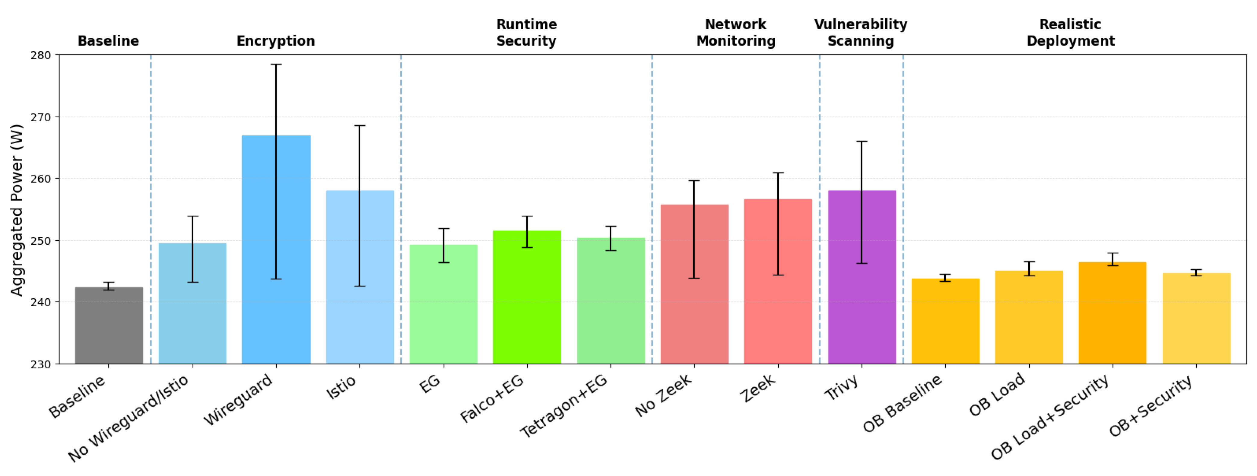 Results show that link encryption (WireGuard) introduces the largest overhead, adding approximately W mean and W peak over the idle baseline (or ≈17.4 W mean compared to plain iperf), while Istio with mTLS is the second most demanding mechanism, contributing ≈15.7 W mean over idle and ≈8.5 W marginal overhead relative to the unencrypted workload. Runtime monitors impose comparatively small costs under repeated security events, as Falco + EG add ≈2.3 W, while Tetragon + EG add ≈1.2 W. For network monitoring, Zeek introduces a modest ≈0.9 W marginal overhead, even though the high-rate UDP spray itself increases power consumption by ≈13.3 W on average. Vulnerability scanning with Trivy was executed on top of the Online Boutique deployment with all security mechanisms enabled; thus, the experimental baseline corresponds to the full OB + Security configuration. Under these conditions, Trivy adds ≈13.3 W mean and peaks at ≈21.4 W. In the realistic application scenario, enabling security mechanisms during idle traffic results in a small steady marginal overhead of ≈0.9 W, peaking at ≈1.5 W, while under heavy workload the overhead increases to ≈1.4 W mean and ≈3 W peak. Standard deviation reveals that encryption mechanisms exhibit high variability due to the experimental design with three iperf iterations, capturing traffic startup, steady-state, and shutdown phases; similarly, Zeek and Trivy show moderate variability, reflecting UDP spray activation/deactivation and scanning start/stop transitions, respectively. In contrast, eBPF-based monitors and realistic application workloads demonstrate exceptional stability under continuous operation.