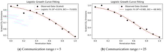 Although the Gompertz model exhibits the second-best fit, its BIC values are consistently higher than those of the Logistic model. The Exponential model performs worst across all communication ranges, yielding the highest BIC values. This result suggests that changes in CO2 emissions do not follow a simple monotonic exponential decay, but instead exhibit a nonlinear structure in which emission reductions emerge gradually with increasing penetration rates and subsequently approach saturation.