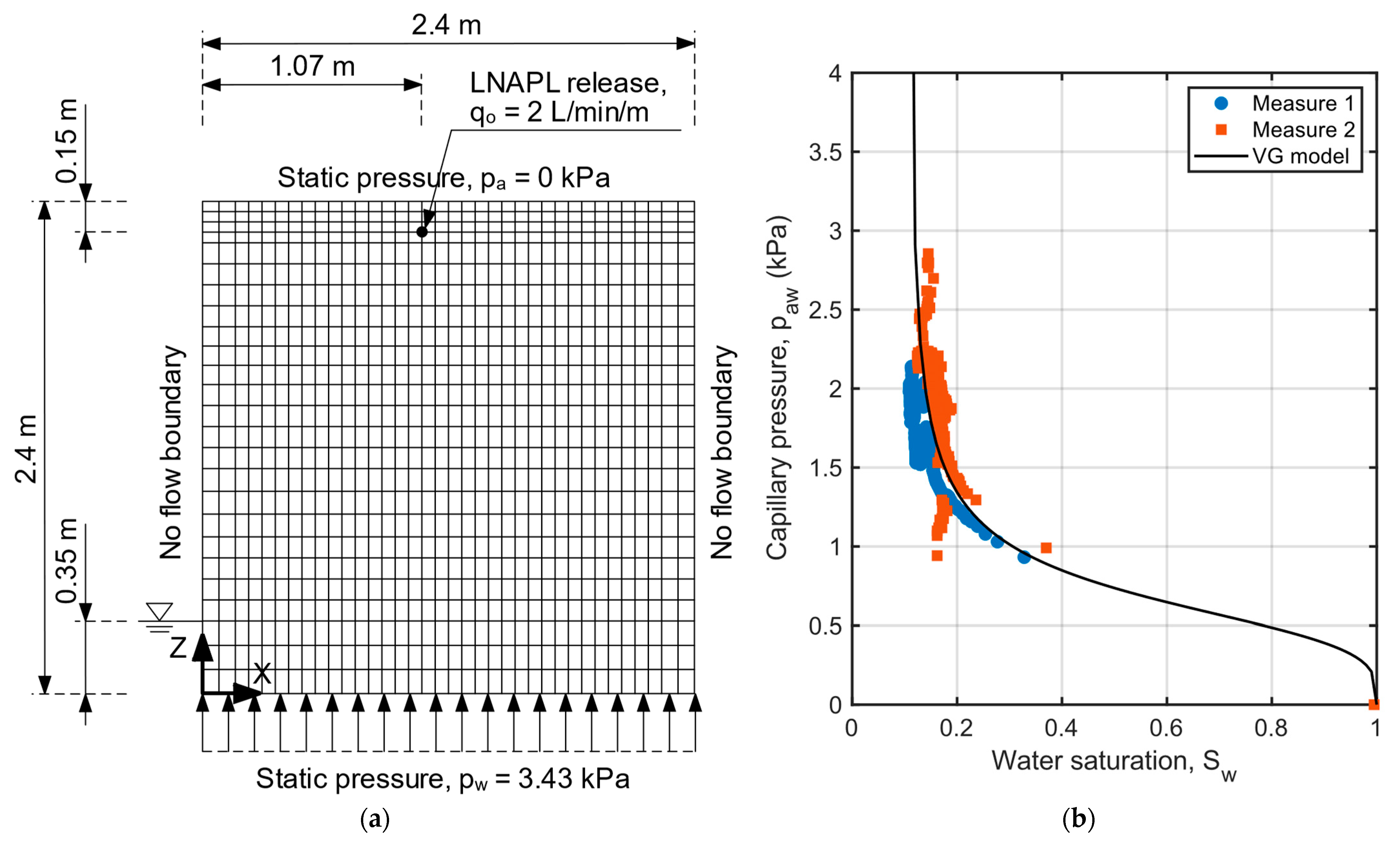 36] can be used for this calculation; however, it presents disadvantages in that it complicates the process because the moisture characteristic curve cannot be described as a continuous function. At present, van Genuchten’s equation is predominantly used for multiphase flow problems.