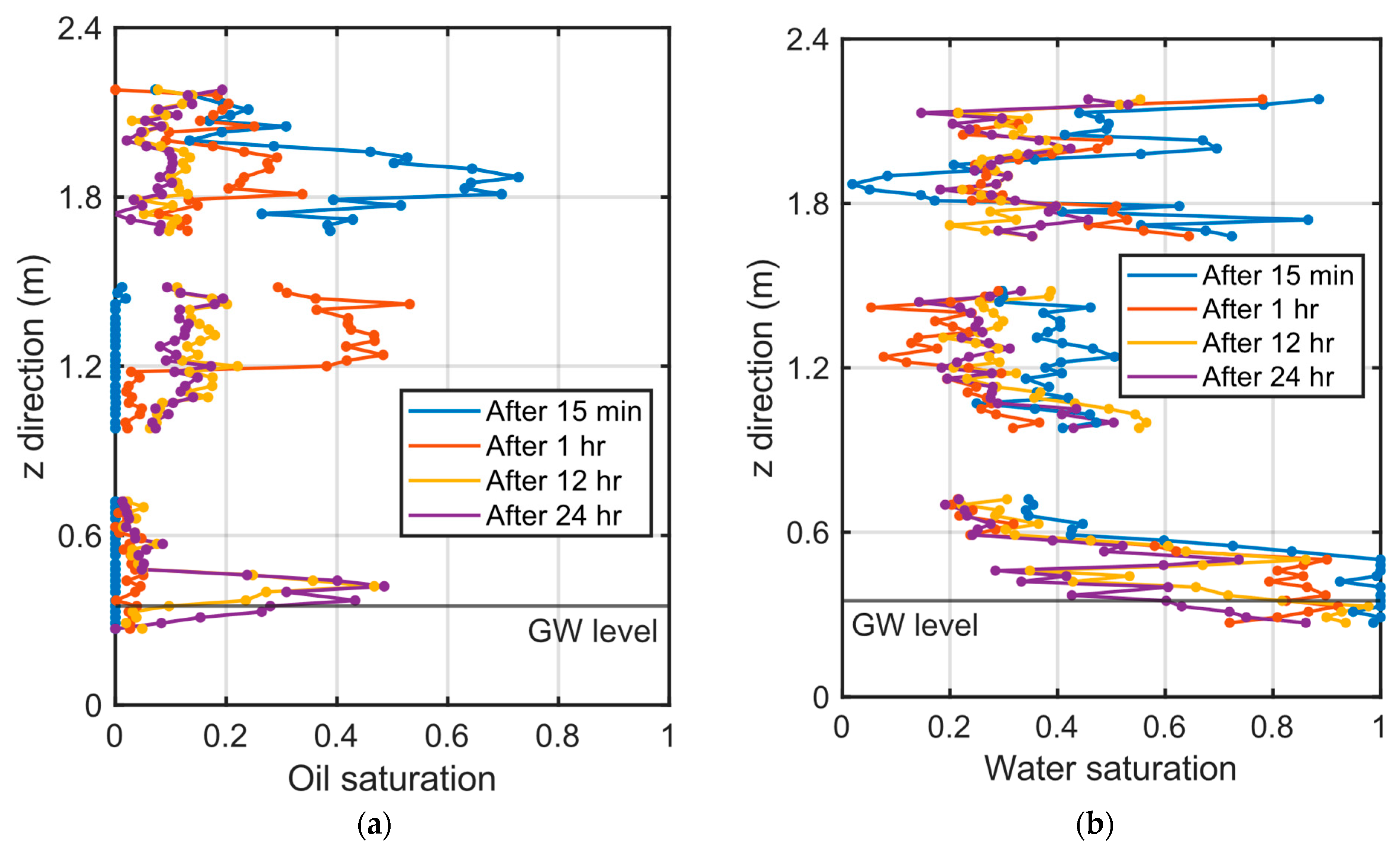 Figure 12a. The white plot represents the distribution after 1 h, the hatched plot represents the distribution after twelve hours, and the black plot represents the distribution after 24 h. Note that oil saturation data at 0.9 and 1.6 m are missing because image analysis could not be applied due to the influence of the steel frame installed in front of the soil tank. One hour after oil injection, the oil had penetrated approximately 1.2 m in the depth direction, with higher oil saturation toward the leading edge of the plume. Oil saturation at the plume tip is estimated to be 40–50%. Subsequently, the oil continued to permeate the soil over time. Twelve hours after injection, oil began accumulating in the capillary zone above the groundwater table. The oil saturation of the accumulated oil layer above the groundwater table was approximately 50%, with a thickness of roughly 20 cm. Furthermore, after 24 h, the volume of oil above the groundwater table had increased significantly, and the influence of the oil extended to the position adjacent to the groundwater table. Along the oil migration path, residual oil saturation of roughly 10% was observed.