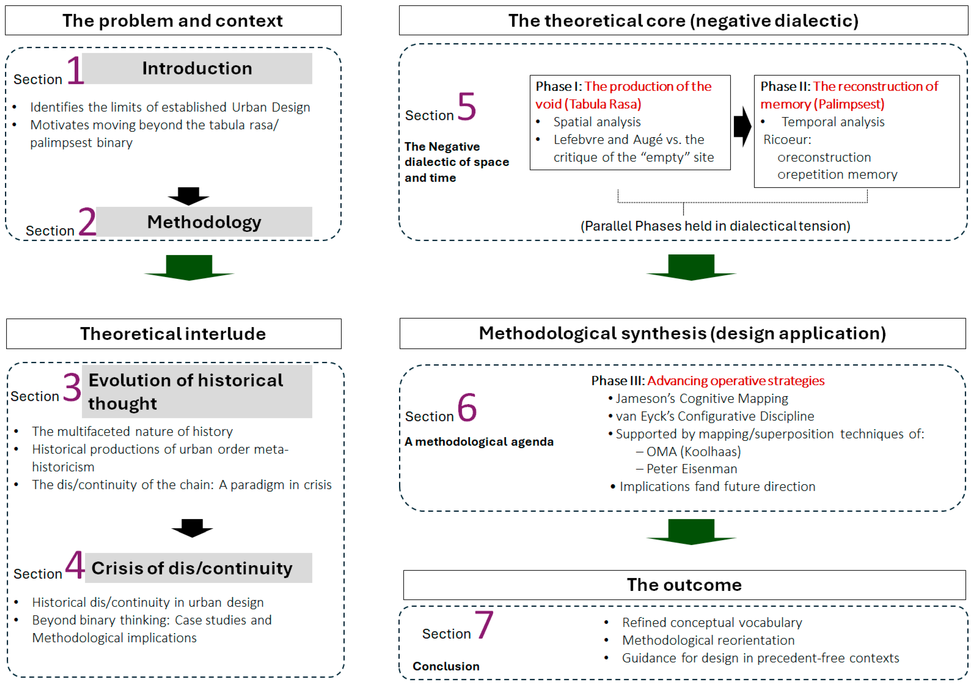 - Second, it proposes a methodological reorientation toward the dialectics of erasure and historical dis/continuity. It assesses the compatibility of established urban design theory and highlights strategies for contexts in which historical precedents.