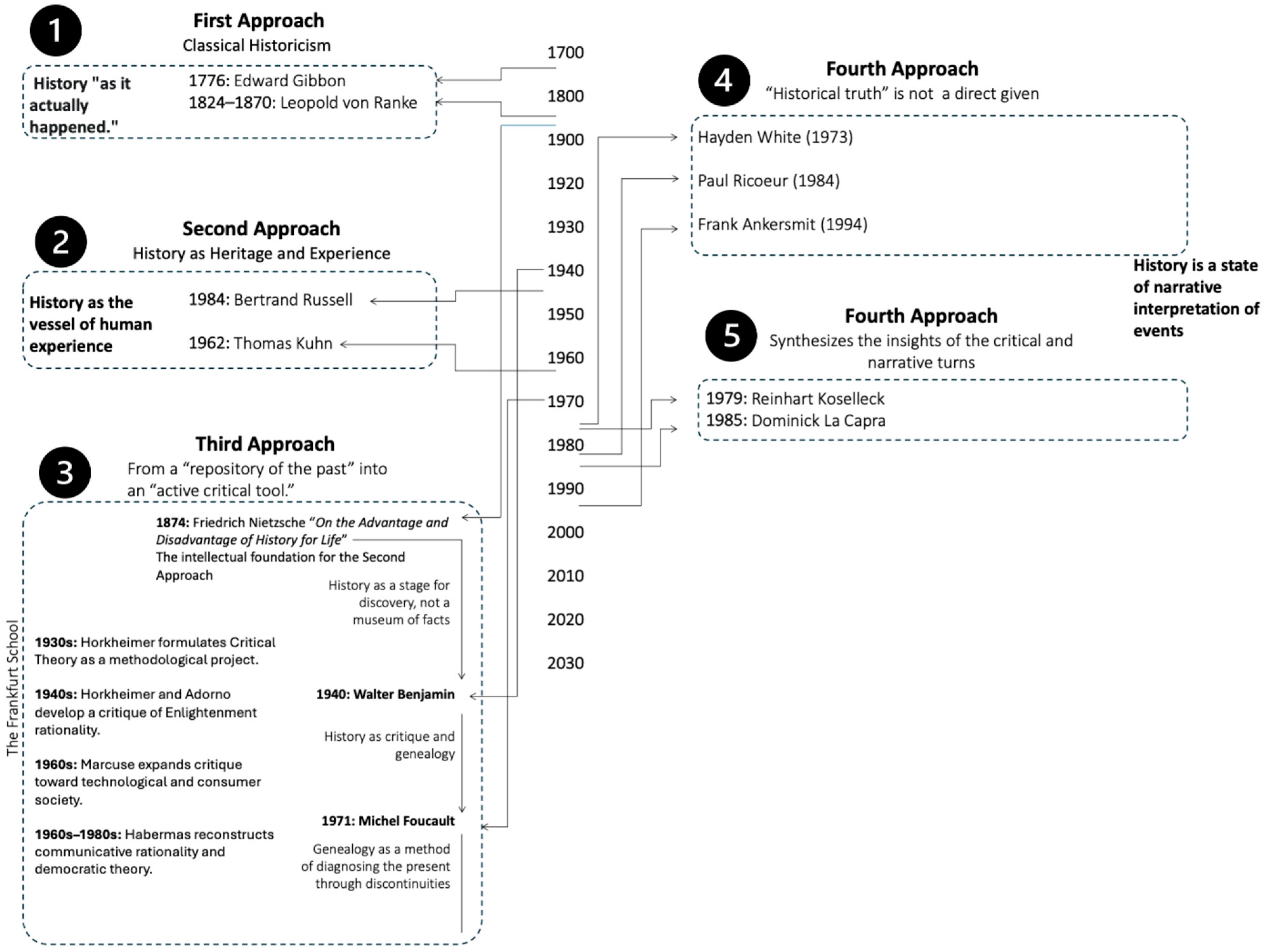 - The fifth stage synthesizes the insights of the critical and narrative turns, foregrounding the historian’s own positionality as an active component in the production of historical knowledge. Reinhart Koselleck [47], in Futures Past—On the Semantics of Historical Time, p. 3–20, warned against collapsing temporal layers into simplistic analogies that project the logic of the present onto the past. Dominick La Capra [48], in History and Criticism, pp. 15–20, advocated a responsible middle path that resists both rigid objectivism, which denies interpretation, and absolute relativism, which dissolves meaning entirely.