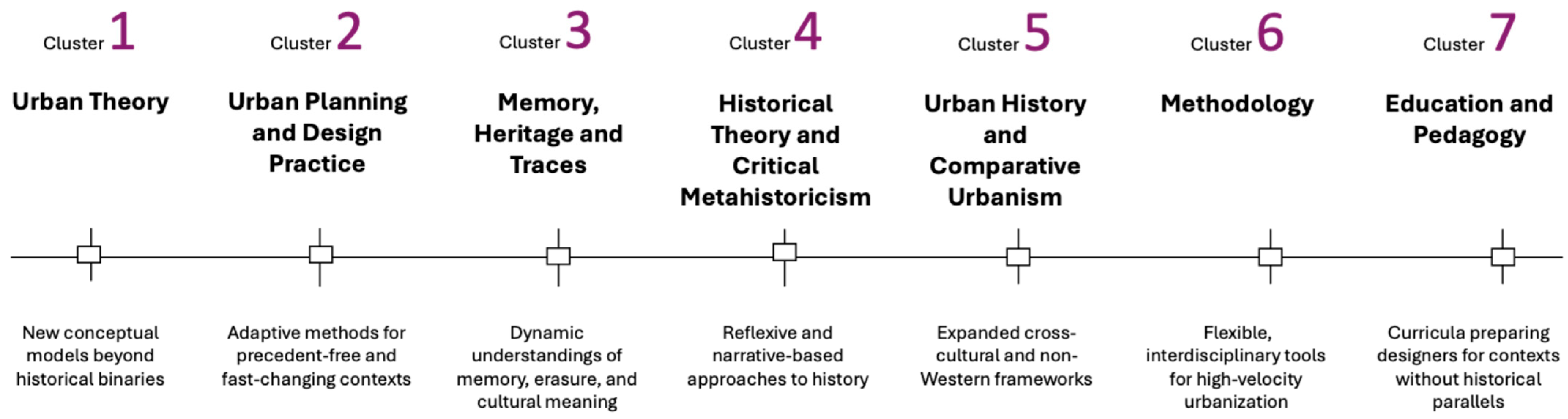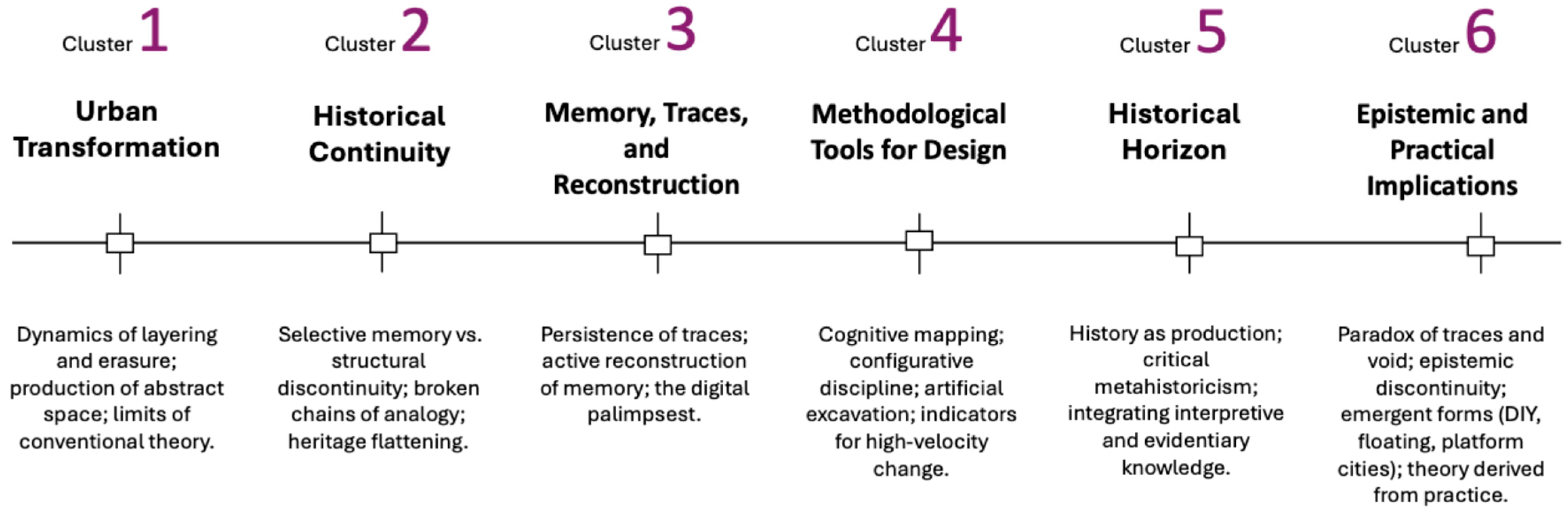 - Cluster 4 discusses historical theory and critical metahistoricism, highlighting reinterpretation of history in contemporary and future urban practice.