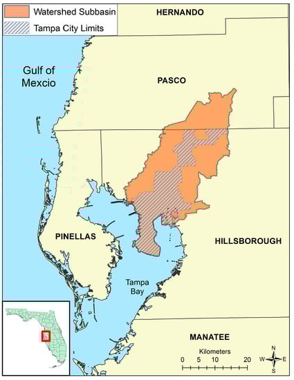 The study area subbasin, including the entirety of the City of Tampa, located inside the greater Tampa Bay Watershed, Florida, USA.