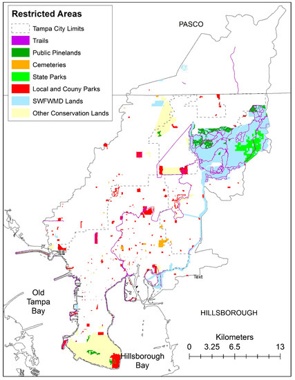 The following datasets were used to process this layer (Table 1): Florida State Parks [53], Local and County-owned Parks and Recreational Areas [54], Public and Private Managed Conservation Lands [55], Publicly Managed Pinelands [56], Current SWFWMD Managed Land [57], Florida Cemetery Facilities [58], and Existing Florida Trails [59].