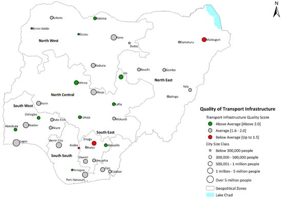 The sudden revenues received from oil in the 1970s created the conditions for major investments in infrastructure capacity, notably ports, roads, bridges, and airports [13,14]. Reductions in Federal budgets due to fluctuations in oil prices in the 1980s resulted in no significant additions to infrastructure capacity, as well as a lack of funds destined to the maintenance of existing infrastructure. This caused a deterioration of the country’s road network [15]. As roads are essential for the distribution of goods, a failing road system is a major constraint for economic growth. The deficiencies of the power supply and the impacts on growth and productivity is another major issue in Nigeria [16].