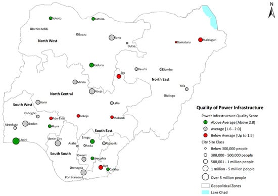 Analysis of the top 20 percent cities exhibiting relatively higher quality power infrastructure was conducted. A total of eight cities belong to this category. They include Lagos (South West), Katsina (North West), Akure (South West), Umuahia (South East), Calabar (South South), Kaduna (North West), Enugu (South East), and Sokoto (North West). Conversely, the bottom 20 percent of cities with the lowest power quality score include Lokoja (North Central), Jos (North Central), Damaturu (North East), Maiduguri (North East), Uyo (South South), Ado-Ekiti (South West), Makurdi (North Central), and Asaba (South South). With the exception of Asaba, all the other low scoring cities are severely impacted by unreliable power supply. For Asaba, the main factor contributing to its low score was the low rate at which businesses secured connectivity to the electricity grid within the statutory period of one week.