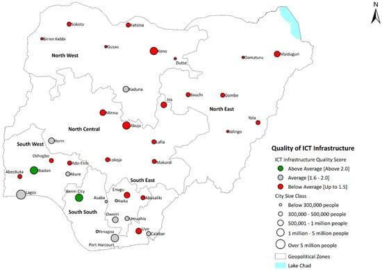 Eight cities are included in the top 20 percent of cities exhibiting relatively high quality ICT infrastructure. They include Ibadan (South West), Benin City (South South), Lagos (South West), Akure (South West), Ilorin (North Central), Awka (South East), Calabar (South South), and Umuahia (South East). A similar analysis was conducted to determine the cities that belong to the bottom 20 percent. The eight cities with the lowest ICT quality score are Birnin Kebbi (North West), Damaturu (North East), Lafia (North Central), Dutse (North West), Lokoja (North Central), Ado-Ekiti (South West), Katsina (North West), and Yola (North East). Figure 7 shows the spatial distribution of the cities by their ICT policy area score and corresponding population class sizes. The map shows an apparent north-south divide. Relatively higher quality of ICT infrastructure appears to favour cities in southern Nigeria. Comparatively lower telecoms penetration is main driver of low ICT quality for five of the lowest scoring cities (Birnin Kebbi, Damaturu, Lafia, Dutse, and Lokoja). For the other three cities the level of internet use amongst business establishments is comparatively lower and it accounts for a relatively low ICT score.