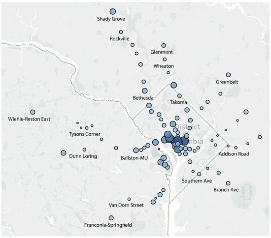Data from fare card records was acquired from the Washington Metropolitan Area Transit Authority (WMATA). Each record in this dataset consist of four values: entry station, entry time, exit station, and exit time. Based on these records, on average, there are 600,000 trips per weekday, 200,000 trips on weekends, and a total of 14 million trips per month. Not all stations are equally busy. For illustration, reconsider Figure 1, which not only shows the station locations, but also its respective passenger volume (indicated by circle size and color). Larger circles of darker color represent more passenger traffic. For example, the busiest station during January 2017 was Union Station with 650,000 passengers beginning their trip at this station. In contrast, only 24,000 passengers entered the least frequented station, Cheverly, during the same time period.