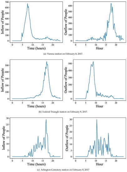 We aggregated the passenger inflows and outflows at stations per 15 min intervals to construct time series of traffic volume per station. The passenger volume is not only station specific, but also time specific. Consider here the example of the Vienna station to the east of Washington, DC. Vienna is the most western Orange Line station, located at a residential area. It is a classical commuter station, i.e., people take the metro in the morning commuting towards the city center and return likewise in the afternoon. A typical weekday passenger volume graph for this station, observed on Wednesday, February 8, 2017, is shown in Figure 2a. A station located at the city center, such as Federal Triangle (cf. Figure 2b), shows a complementary flow, i.e., people exiting the station in the morning and entering it in the afternoon to return home. Figure 2c shows a somewhat different station, “Arlington Cemetery”, with people arriving and leaving throughout the day. Notice here the significantly lower passenger volume when compared to commuter stations, i.e., 30 vs. 600 passengers per peak 15 min interval (temporal granularity of graph). Observing these passenger volume fluctuations with respect to stations and time, our goal is now to assess and predict it.