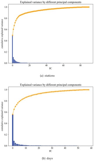 Explained variance per principal component of the PCA on (a) the time series of stations and (b) the time series of days.