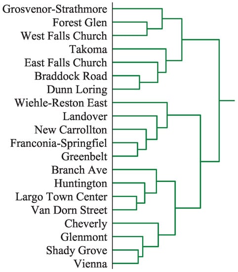 Once time series have been transformed into a lower dimensional feature space using PCA, we can cluster similar days and train stations. To identify similar stations, we cluster the latent features of inflow and outflow of all stations over the full time horizon . For this purpose we use hierarchical agglomerative clustering, often used to cluster features of high-dimensional data such as text [24,25] using the single-link distance to merge clusters in each iteration. This approach yields a cluster dendrogram, which we can analyze visually to identify the number k of meaningful clusters. Using k, we cluster the latent feature space using k-means [26]. We use the same approach to cluster the latent features of all days to find groups of similar days. Our proof of concept in Section 7 provides dendrograms based on the Washington, DC metro passenger volume, which show that the PCA features do indeed allow to group semantically similar metro stations. For this dataset, our clustering approach allows to automatically group (i) days into weekdays and weekends, and (ii) stations into commercial, residential, mixed, but also downtown and suburban.