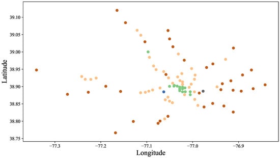 A third characteristic cluster is the inner ring of stations around DC (depicted as orange dots in the figure), which serves mixed (residential and business) areas. At these stations, incoming and outgoing passenger volume peaks in the morning as well as afternoon (“camel back” pattern).