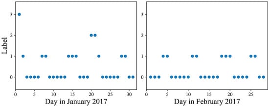 Following the elbow method to determine a useful number of clusters, we present the decrease of the sum of squared distances of samples to their closest cluster center, as we increase k from 2 to 20 clusters in Figure 7. No clear elbow can be seen. We choose k = 4, expecting to see the categories of weekdays, weekends and a few special days or outliers. Figure 8 shows the result of running a 4-means clustering on the latent features of the days of January and February 2017. We see that weekends and holidays were perfectly grouped together, keeping in mind that Monday, January 2 was the observed ‘New Year’s Day’, Monday, January 16 was a federal holiday (Martin Luther King Day), and Monday, February 20 was President’s Day, another federal holiday. Normal week days perfectly fit into the other clusters.There are two outliers which constitute their own cluster: January 20 and January 21, Inauguration Day and the day of the Women’s march, respectively. Both days had unusual event specific passenger volumes and some stations were closed. This shows that the latent features of our passenger volume data can be used to distinguish between days of the week and weekends, and to detect ‘special’ days such as holidays.