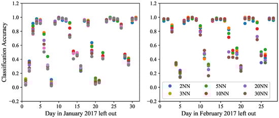 Furthermore, we observe a lower accuracy for February 4 and February 5, which was initially surprising. However, further research on metro operations revealed that several stations were closed for maintenance. The last outlier is Sunday, January 8, a day on which only five out of 91 stations were classified correctly. We attribute this low accuracy to the lowest observed passenger volume (by far) on this day in our entire dataset. Only 108,000 passengers frequented the metro on this day, while the next lowest volume was 170,000 passengers (another Sunday), and most weekdays have upwards of 600,000 passengers. Over all the days, the average precision of 5NN was approximately , which is a strong result considering that this is a 91-class classification problem, where random guessing would yield an expected accuracy of less than .