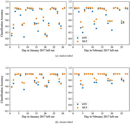 Having chosen k = 5, we compare our latent feature based 5NN classification to the MLP classifier and present the results in Figure 10a. We observe that both methods yield comparable classification accuracy results. On about a third of the days, the kNN classification marginally outperforms the MLP, while for the remaining cases the reverse holds. Nonetheless, both results are very similar. We observe that most of the weekdays show a or higher accuracy, implying that the vast majority of train stations was identified correctly for those days. This accuracy drops to about for most weekend days, implying that weekends show a higher variability in terms of passenger flow. Furthermore, we have fewer weekend days than weekdays, such that some of the lower accuracy can be attributed to having fewer training instances. We also note a poor accuracy on January 1, a day that is untypical due to the new years celebrations, as well as Inauguration Day on January 20 and the Women’s March on January 21. The similar effect of those days on clustering has been explained in Section 6.