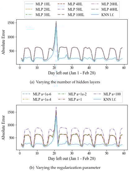 Figure 11b shows the absolute error averaged for all 91 stations, for different values of the parameter a. This parameter is for regularization (penalty) term, that combats overfitting by constraining the size of the weights. Increasing a may fix high variance (a sign of overfitting) by encouraging smaller weights, resulting in a decision boundary plot that appears with lesser curvatures. Similarly, decreasing a may fix high bias (a sign of underfitting) by encouraging larger weights (http://scikit-learn.org/stable/auto_examples/neural_networks/plot_mlp_alpha.html) [27]. It can be observed that increasing a to 100 can lead to higher prediction errors. On the other hand, for a between and 1 the MLP errors remain almost the same. The computational cost does not vary significantly with a in our experiments. Thus, we choose the default parameter of , which is also the predefined value by the scikit-learn implementation.