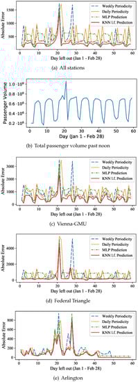 Figure 12c–e show the prediction errors for three individual stations: Vienna-GMU (suburban), Federal Triangle (central) and Arlington Cemetery (outlier). The first two have higher absolute errors as they also have significantly larger passenger volumes than Arlington station. The Federal Triangle is located at the center of D.C. and has lower errors on most days, except for Inauguration Day and the Women’s March, where the kNN prediction still outperforms both the neural network (MLP) as well as the periodicity-based approaches. Other than the two outliers, the latent feature based kNN method gives near-zero prediction error for most of the remaining days. This is expected, as the behavior of passengers should be easier to predict on normal days at a central station that commuters visit daily to go to work. A similar behavior can be observed for Vienna-GMU, a suburban station that residents commute from to get to work. Arlington Cemetery on the other hand has more varying prediction errors. They are higher (400–800 passengers) on the week of January 19–25, while the Weekly Periodicity prediction gives high errors for the next week as well. For all three stations, the latent feature based kNN prediction method demonstrates lower errors than employing a basic artificial neural network (MLP) or simply relying on the Daily or Weekly Periodicity.