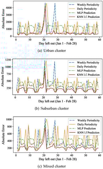 In the Figure 13a–c we present the absolute prediction errors, averaged over the stations that consist each of the three major clusters of the 5-means, as shown in Figure 6. These are the urban cluster (green central stations), the suburban cluster (dark red outer ring) and the mixed clusters (yellow inner ring). In all these experiments, the latent feature based kNN approach outperforms the daily and weekly periodicity predictions, as well as the MLP prediction. For the stations that belong to the urban cluster, located mostly at the city center, even on “normal” days (i.e., excluding the outliers of 1/20 and 1/21) the average prediction error may exceed 2000 passengers on some days for the weekly and daily periodicity, while it always remains below 600 for the latent feature based kNN approach. On these typical weekdays, the prediction error of the MLP is on average up to four times higher than that of the latent feature based prediction. A similar behavior can be observed for the suburban cluster on Figure 13b, but the average absolute errors are generally lower (below 1250) for all dates and methods. The MLP again fail to outperform kNN on typical weekdays, having about double the prediction error. The mixed cluster contains stations in areas that can be both for business and residential. Both the weekly and the daily periodicity prediction introduce high errors (peaks are between 600 and 1000 passengers) on many dates, the MLP errors are of more than 400 passengers even on normal weekdays and peak on 900 passengers for the outlier days, while the latent feature based kNN prediction remains low, below 300 passengers, on all normal days, and it is 20% better on the two outlier days.