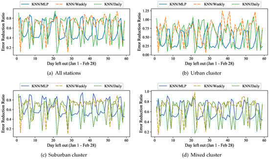 Examining the groups of stations that fall in each of the three major clusters of the 5-means separately, we can observe a relatively similar behavior as described above for the full set of stations. Figure 14b shows the relative reduction in prediction error only for those stations that belong to the urban cluster. Our approach outperforms the two baselines, with only two exceptions: Monday, February 6 and Friday, February 10, where the weekly periodicity gives 25% and 23% better results, respectively. On both those dates, however, the relative errors of both approaches are already below 0.054 and below 0.044, respectively. In terms of the MLP, the gain of the latent feature-based approach is more evident for the results of the urban cluster. Our approach outperforms the MLP on every day. It achieves on average 25% lower errors on the weekends, while it achieves a four times higher prediction quality than the MLP over the weekdays. Furthermore, our method outperforms the periodicity-based approaches as well as the neural network prediction (MLP) on every single date for both the suburban and mixed clusters of stations, as shown in Figure 14c,d.