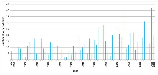 Number of “very hot days” (days with equal or higher temperatures than 30 °C) in Vienna in the period 1954–2016; graphic based on data from ZAMG (Zentralanstalt für Meteorologie und Geodynamik) [18].