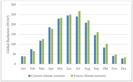 The mean temperature for the future climate scenario in July is 2.6 °C above the current climate scenario, and therefore, fewer hours where night cooling can take place are possible (see Figure 2). Also, the global radiation in the summer month is about 10% higher in the future climate scenario than in the current climate scenario (see Figure 3).