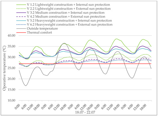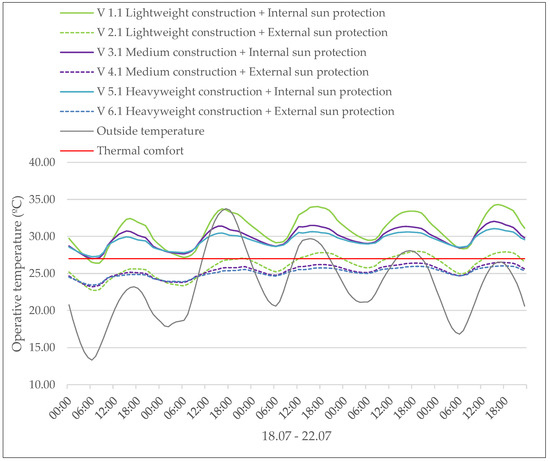 In these variants (V 1.1–V 6.1), the influence of the thermal mass and the sun protection is examined. Three wall materials (wood, brick, and concrete construction) and two sun protection solutions (internal and external sun protection) were defined and analyzed. The detailed results are shown in Figure 4, with the key findings: