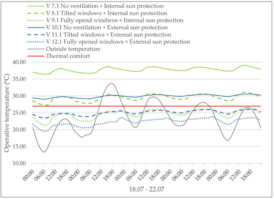 Based on the TRNSYS simulation, the operative temperature in the room is evaluated without considering a cooling capacity in the building. This means that only the passive design measures are considered within the calculations. Within the analysis of a whole year, the temperatures during a five-day period are analyzed in detail. The results are divided into the current climate scenario (see Section 3.1) and the future climate scenario (see Section 3.2). The limiting temperature for acceptable thermal comfort in Austria for living rooms is defined at 27° [32]). This temperature is shown in the Figures to indicate which variants still achieve the thermal comfort requirements.