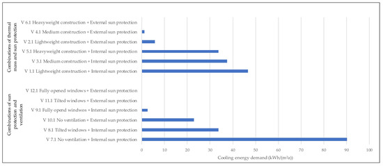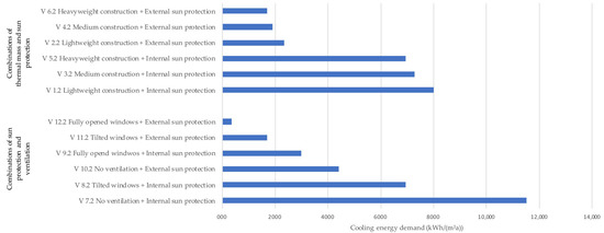 As for the future climate scenario, the theoretical cooling energy demand is evaluated for the exemplary room. Figure 9 shows that in the future climate scenario, each of the examined variants has a cooling energy demand, mainly because the temperature during the night is higher and therefore night ventilation is not as effective. The key findings are: